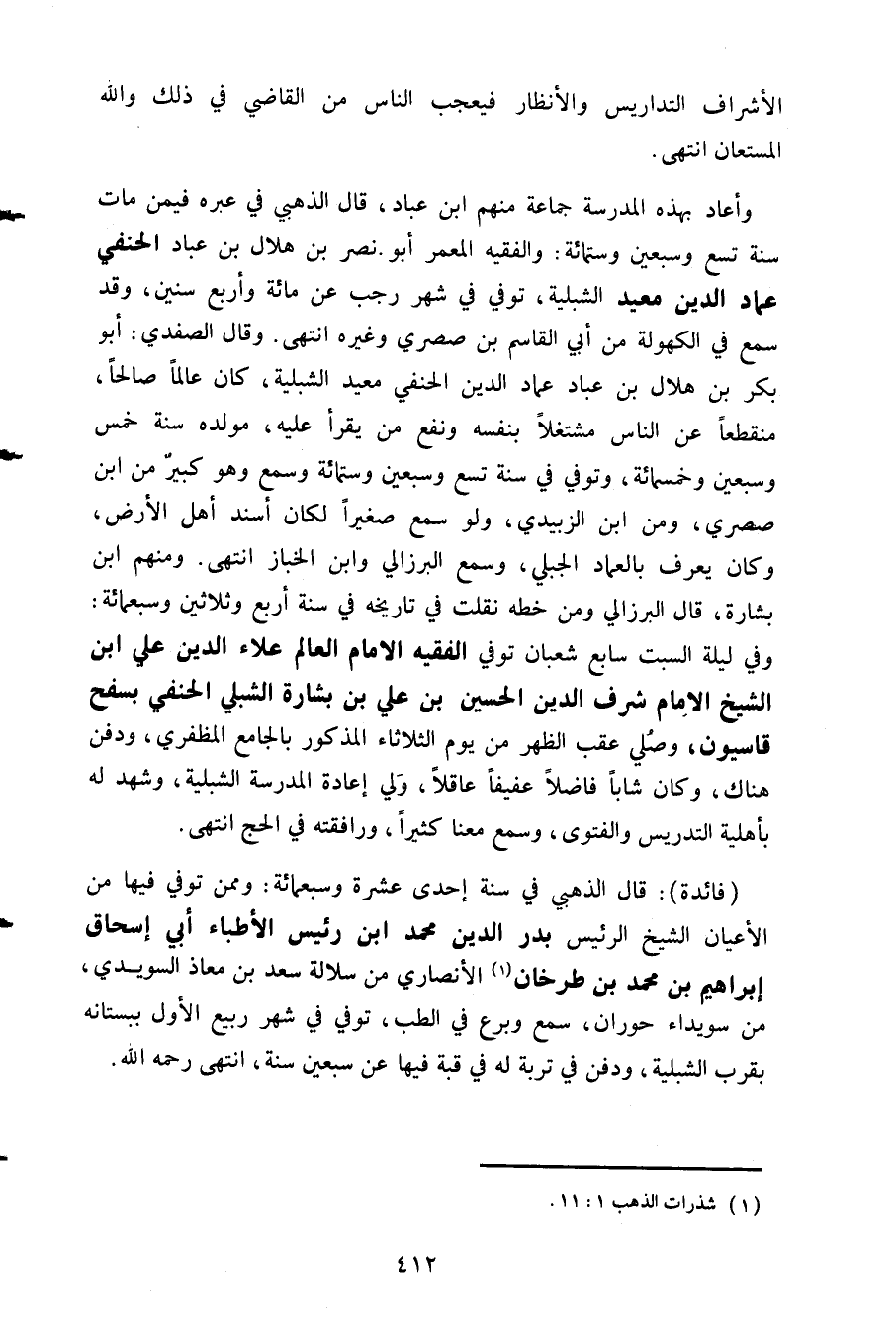 (فائدة) قال الذهبي في سنة إحدى عشرة وسبعمائة وممن توفي فيها من الأعيان الشيخ الرئيس بدر الدين محمد ابن رئيس الأطباء أبي إسحاق إبراهيم بن محمد بن طرخان الأنصاري من سلالة سعد بن معاذ السويدي من سويداء حوران سمع وبرع في الطب توفي في شهر ربيع الأول ببستانه بقرب الشبلية ودفن في تربة له في قبة فيها عن سبعين سنة انتهى رحمه الله