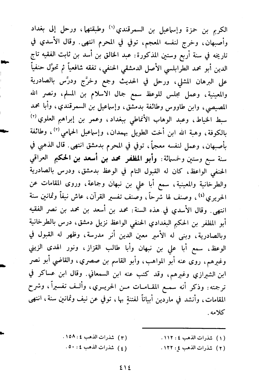 الكريم بن حمزة وإسماعيل بن السمرقندي1 وطبقتهما ورحل إلى بغداد وأصبهان وخرج لنفسه المعجم توفي في المحرم انتهى. وقال الأسدي في تاريخه في سنة أربع وستين المذكورة: عبد الخالق بن أسد بن ثابت الفقيه تاج الدين أبو محمد الطرابلسي الأصل الدمشقي الحنفي تفقه شافعيا ثم تحول حنفيا على البرهان المشلي ورحل في الحديث وجمع وخرج ودرس بالصادرية والمعينية وعمل مجلس للوعظ سمع جمال الإسلام بن المسلم ونصر اللد المصيصي وابن طاووس وطائفة بدمشق وإسماعيل بن السمرقندي وأبا محمد سبط الخياط وعبد الوهاب الأنماطي ببغداد وعمر بن إبراهيم العلوي2 بالكوفة وهبة إله ابن أخت الطويل بهمدان وإسماعيل الحمامي3 وطائفة بأصبهان وعمل لنفسه معجما توفي في المحرم بدمشق انتهى. قال الذهبي في سنة سبع وستين وخمسمائة: وأبو المظفر محمد بن أسعد بن الحكيم العراقي الحنفي الواعظ كان له القبول التام في الوعظ بدمشق ودرس بالصادرية والطرخانية والمعينية سمع أبا علي بن نبهان وجماعة وروى المقامات عن الحريري4 وصنف لها شرحا وصنف تفسير القرآن عاش نيفا وثمانين سنة انتهى. وقال الأسدي في هذه السنة: محمد ب أسعد بن محمد بن نصر الفقيه أبو المظفر بن الحكيم البغدادي الحنفي الواعظ نزيل دمشق درس بالطرخانية وبالصادرية وبنى له الأمير معين الدين أنر مدرسة وظهر له القبول في الوعظ سمع أبا علي بن نبعان وأبا طالب القزاز ونور الهدى الزيني وغيرهم روى عنه أبو المواهب وأبو القاسم بن صصري والقاضي أبو نصر ابن الشيرازي وغيرهم وقد كتب عنه ابن السمعاني. وقال ابن عساكر في ترجمته: وذكر أنه سمع المقامات من الحريري وألف تفسيرا وشرح المقامات وأنشد في ماردين أبياتا لفتنة بها توي عن نيف وثمانين سنة انتهى كلامه.