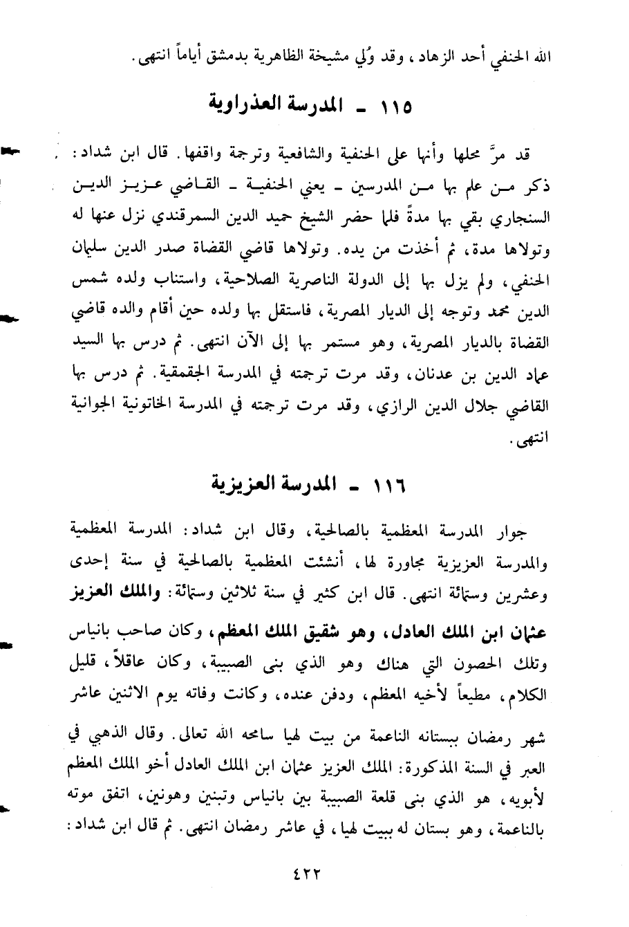 قد مر محلها وأنها على الحنفية والشافعية وترجمة واقفها. قال ابن شداد: ذكر من علم بها من المدرسين - يعني الحنفية - القاضي عزيز الدين السنجاري بقي بها مدة فلما حضر الشيخ حميدالدين السمرقندي نزل عنها له وتولاها مدة ثم أخذت من يده وتولاها قاضي القضاة صدر الدين سليمان الحنفي ولم يزل بها إلى الدولة الناصرية الصلاحية واستناب ولده شمس الدين محمد وتوجه إلى الديار المصرية فاستقل بها ولده حين أقام والده قاضي القضاة بالديار المصرية وهو مستمر بها إلا الآن انتهى. ثم درس بها السيد عمادالدين بن عدنان وقد مرت ترجمته في المدرسة الجقمقية ثم درس بها القاضي جلال ادين الرازي وقد مرت ترجمته في المدرسة الخاتونية الجوانية انتهى.