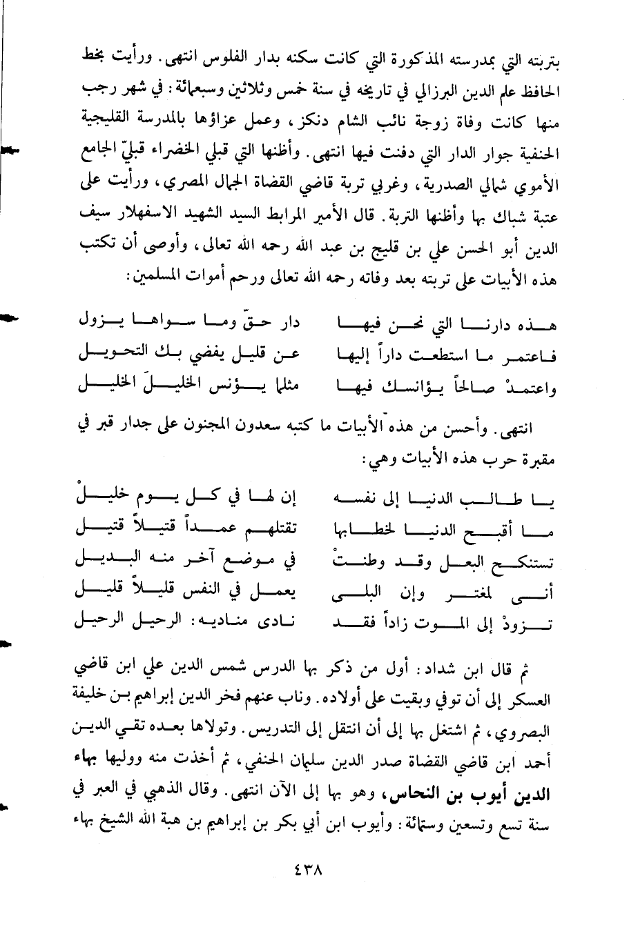 ثم قال ابن شداد أول من ذكر بها الدرس شمس الدين علي ابن قاضي العسكر إلى ان توفي وبقيت على أولاده وناب عنهم فخر الدين إبراهيم بن خليفة البصروي ثم اشتغل بها إلى ان انتقل إلى التدريس وتولاها بعده تقي الدين أحمد ابن قاضي القضاة صدر الدين سليمان الحنفي ثم أخذت منه ووليها بهاء الدين أيوب بن النحاس وهو بها إلى الآن انتهى وقال الذهبي في العبر في سنة تسع ة تسعين وستمائة وأيوب ابن أبي بكر بن إبراهيم بن هبة الله الشيخ بهاء