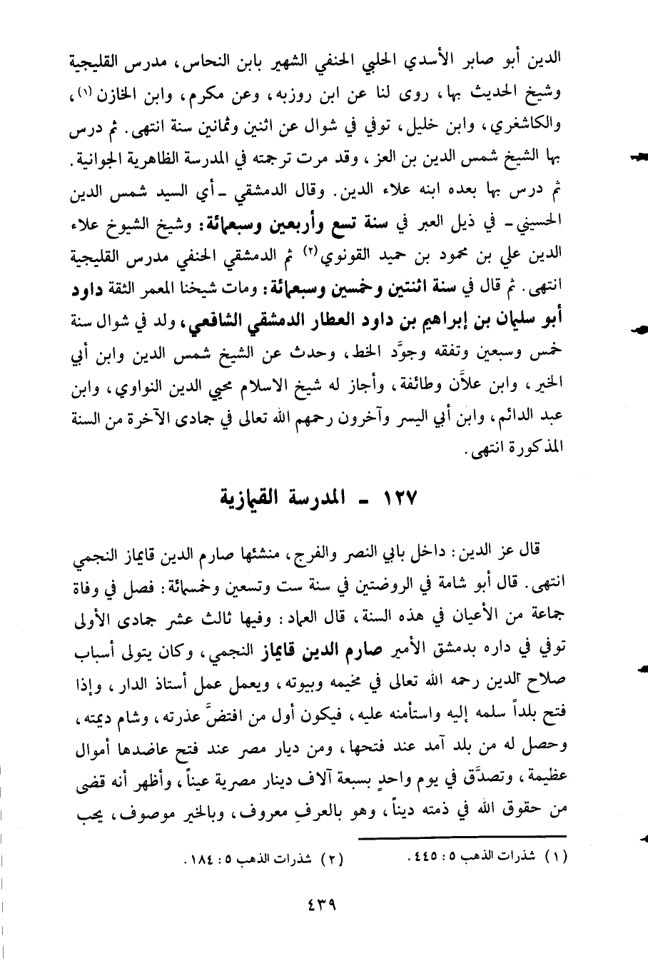 الدين أبو صابر الأسدي الحلبي الحنفي الشهير بابن النحاس مدرس القليجية وشيخ الحديث بها روى لنا عن ابن روزبه وعن مكرم وابن الخازن والكاشغري وابن الخليل توفي في شوال عن اثنتين وثمانين سنة انتهى ثم درس بها الشيخ شمس الدين بن العز وقد مرت ترجمته في المدرسة الظاهرية الجوانية ثم درس بها بعده ابنه علاء الدين وقال الدمشقي أي السيد شمس الدين الحسيني في ذيل العبر في سنة تسع وأربعين وسبعمائة وشيخ الشيوخ علاء الدين علي بن محمود بن حميد القونوي ثم الدمشقي الحنفي مدرس القليجية انتهى ثم قال في سنة اثنتين وخمسين وسبعمائة ومات شيخنا المعمر الثقة داود أبو سليمان بن إبراهيم بن داود العطار الدمشقي الشافعي ولد في شوال سنة خمس وسبعين وتفقه وجود الخط وحدث عن الشيخ شمس الدين وابن أبي الخير وابن علان وطائفة واجاز له شيخ الإسلام محيي الدين النواوي وابن عبد الدائم وابن أبي اليسر وآخرون رحمهم الله تعالى في جمادى الآخرة من السنة المذكورة انتهى