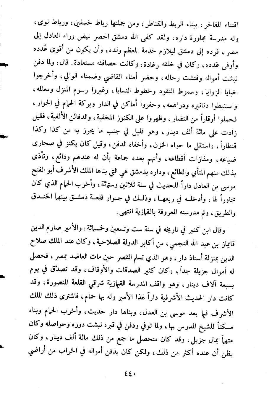 قتتاء المفاخر ببناء الربط والقناطر ومن جملتها رباط خسفين ورباط نوى وله مدرسة مجاورة داره ولقد كفى الله دمشق الحصر نهض وراء العال إلى مصر فرده إلى دمشق ليلازم خدمة المعظم ولده وان يكون م أقوى عدده واوفى عدده وكان في خلقه رغادة وكانت حصافئه مستعادة. قال: ولما دفن نبشت أمواله وفتشت رحاله وحضر أمناء القاضي وضمناء الوالي وأخرجوا خبايا الزوايا وسموط النقود وخطوط النسايا وغيروا رسوم المنزل ومعالمهن واستنبطوا دنانيره ودراهمه وحفروا أماكن في الدار وبركة الحمام في الجوار فحملوا أوقارا من النضار وظهروا على الكنوز المخفية والدفائن الألفية فقيل زادت على مائة ألف دينار وهو قليل في جنب مايحرز به من كذا وكذا قنطاران واستقل ما حواه الحزن واخفاه الدفن وقيل كان يكنز في صحاري ضياعه ومفازات اقطاعه واتهم بعده جماعةبأن له عندهم ودائع وتأذى بذلك منهم المأبي والطائع وداره بدمشق هي التي بناها الملك الأشرف أبو الفتح موسى بن العادل دارا للحديث فيسنة ثلاثين وستمائة وأخرب الحمام الذي كان مجاورا لها وأدخله في ربعها نذلك في جوار قلعة دمشق بينهما الخندق والطريق وثم مدرسته المعروفة بالقمازية انتهى.