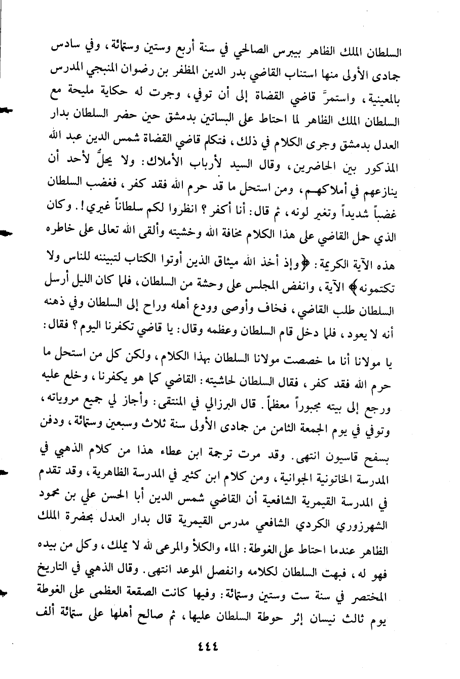 السلطان الملك الظاهر بيبرس الصالحي في سنة أربع وستين وستمائة وفي سادس جمادى الأولى منها استناب القاضي بدر الدين المظفر بن رضوان النبجي المدرس بالمعينية واستمر قاضي القضاة إلى ان توفي وجرت له حكاية مليحة مع السلطان الملك الظاهر لما احتط على البساتين بدمشق حين حضر السلطان بدار العدل بدمشق وجرى الكلام في ذلك فتكلم قاضي القضاة شمس الدين عبد الله المذكور بين الحاضرين وقال: السيد لأرباب الأملاك ولا يحل لأحد ان ينازعهم في املاكهم ومن استحل ما قد حرم الله فقد كفر فغضب السلطان غضبا شديدا وتغير لونه. ثم قال: أنا أكفر؟ انظروا لكم سلطانا غيري! وكان الذي حمل القاضي على هذا الكلام مخافة الله وخشيته وألقى الله تعالى على خاطره هذه الآية الكريمة {وَإِذْ أَخَذَ اللَّهُ مِيثَاقَ الَّذِينَ أُوتُوا الْكِتَابَ لَتُبَيِّنُنَّهُ لِلنَّاسِ وَلا تَكْتُمُونَهُ} الآية وانفض المجلس على وحشة من السلطان فلما كان الليل أرسل السلطان طلب القاضي فخاف وأوصي وودع أهله وراح إلى السلطان وفي ذهنه أنه لايعود فلما دخل قام السلطام وعظمه وقال يا قاضي تكفرنا اليوم فقال يا مولانا أنا ما خصصت مولانا السلطان بهذا الكلام ولكن كل من استحل ما حرم الله فقد كفر فقال السلطان لحاشيته القاضي كما هو يكفرنا خلع عليه ورجع إلى بيته مجبورا معظما. قال البرزالي في المنتقي: وأجاز لي جميع مروياته وتوفي في يوم الجمعة الثمن من جادي الأولى سنة ثلاث وسبعين وستمائة ودفن بسفح قاسيون انتهى. وقد مرت ترجمة ابن عطاء هذا من كلام الذهبي في المدرسة الخاتونية الجوانية ومن كلام ابن كثير في المدرسة الظاهرية وقد تقدم في المدرسة القيمرية الشافعية ان القاضي شمس الدين أبا الحسن علي بن محمود الشهرزوي الكردي الشافعي مدرس لقيمرية. قال بدار العل بحضرة الملك الظاهر عندها احتاط لى الغوطة: الماء والكلأ والمرعى لله لا يملك وكل من بيده فهو له فبهت السلطان لكلامه ونفصل الموعد انتهى. وقال الذهبي في التاريخ المختصر في سنة ست وستين وستمائة: وفيها كانت الصقعة العظمي على الغوطة يوم ثالث نيسان إثر حوطة السلطان عليها ثم صالح أهلها على ستمائة ألف