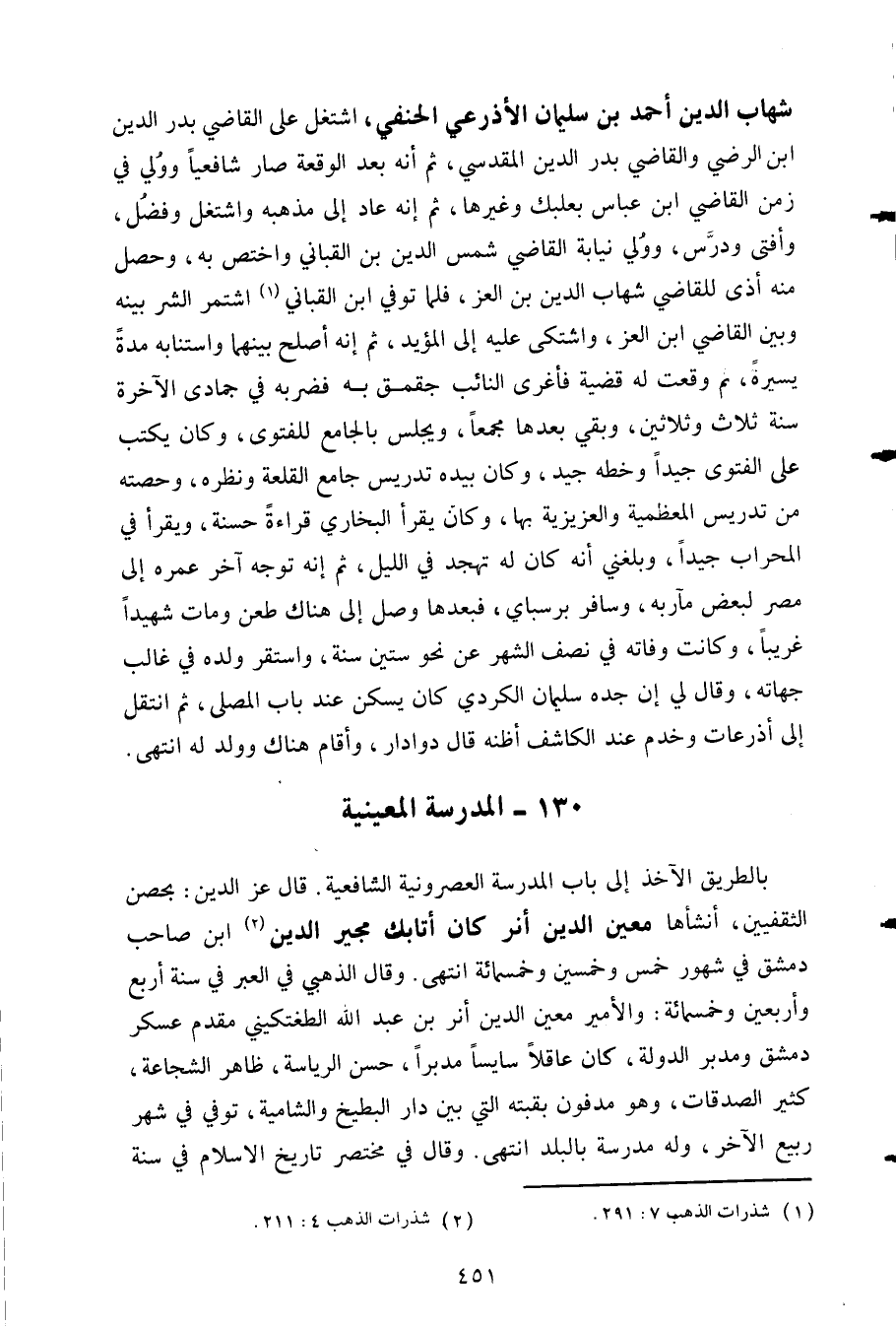 شهاب الدين أحمد بن سليمان الأذرعي الحنفي اشتغل على القضاي بدر الدين ابن الرضي والقاضي بدر الدين المقدسي ثم أنه بعد الوقعة صار شافعيا وولي في زمن القاضي ابن عباس بعلبك وغيرها ثم إنه عاد إلى مذهبه واشتغل وفضل وأفتى ودرس وولي نيابة القاضي شمس الدين بن القباني واختص به وحصل منه أذى للقاضي شهاب الدين بن العز فلما توفي ابن القباني1 اشتمر الشر بينه وبين القاضي ابن العز واشتكى عليه إلى المؤيد ثم إنه أصلح بينهما واستنابه مدة يسيرة ثم وقعت له قضية فأغرى النائب جقمق به فضربه في جمادى الآخرة سنة ثلاث وثلاثين وبقي بعدها مجمعا ويجلس بالجامع للفتوى وكان يكتب على الفتوى جيدا وخطه جيد وكان بيده تدريس جامع القلعة ونظره وحصته من تدريس المعظمية والعزيزية بها وكان يقرأ البخاري قراءة حسنة ويقرأ في المحراب جيدا وبلغني أنه كان له تهجد في الليل ثم إنه توجه آخر عمره إلى مصر لبعض مآربه وسافر برسباي فبعدها وصل إلى هناك طعن ومات شهيدا غريبا وكانت وفاته في نصف الشهر عن نحو ستين سنة واستقر ولده في غالب جهاته وقال لي إن جده سليمان الكردي كان يسكن عند باب المصلى ثم انتقل إلى أذرعات وخدم عند الكاشف أظنه قال دوادار وأقام هناك وولد له انتهى.
