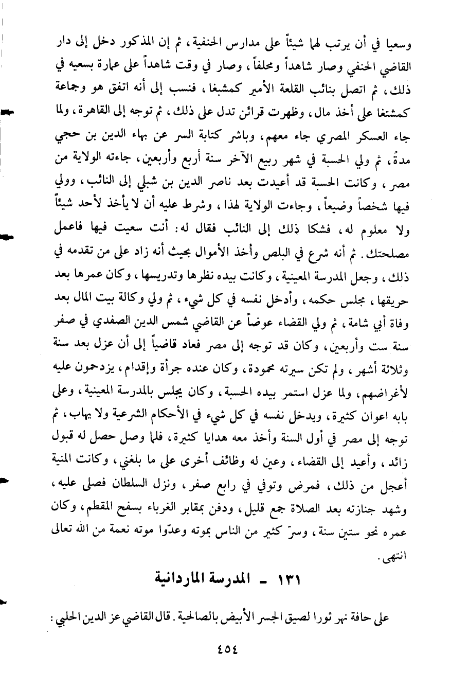 وسعيا في أن يرتب لهما شيئا على مدارس الحنفية ثم إن المذكور دخل إلى دار القاضي الحنفي وصار شاهدا ومحلفا وصار في وقت شاهدا على عمارة بسعيه في ذلك ثم اتصل بنائب القلعة الأمير كمشبغا فنسب إلى أنه اتفق هو وجماعة كمشتغا على أخذ مال وظهرت قرائن تدل على ذلك ثم توجه إلى القاهرة ولما جاء العسكر المصري جاء معهم وباشر كتابة السر عن بهاء الدين بن حجي مدة ثم ولي الحسبة في شهر ربيع الآخر سنة أربع وأربعين جاءته الولاية من مصر وكانت الحسبة قد أعيدت بعد ناصر الدين بن شبلي إلى النائب وولي فيها شخصا وضيعا وجاءت الولاية لهذا وشرط عليه أن لا يأخذ لأحد شيئا ولا معلوم له فشكا ذلك إلى النائب فقال له أنت سعيت فيها فاعمل مصلحتك ثم أنه شرع في البلص وأخذ الأموال بحيث أنه زاد على من تقدمه في ذلك وجعل المدرسة المعينية وكانت بيده نظرها وتدريسها وكان عمرها بعد حريقها مجلس حكمه وأدخل نفسه في كل شيء ثم ولي وكالة بيت المال بعد وفاة أبي شامة ثم ولي القضاء عوضا عن القاضي شمس الدين الصفدي في صفر سنة ست وأربعين وكان قد توجه إلى مصر فعاد قاضيا إلى أن عزل بعد سنة وثلاثة أشهر ولم تكن سيرته محمودة وكان عنده جرأة وإقدام يزدحمون عليه لأغراضهم ولما عزل استمر بيده الحسبة وكان يجلس بالمدرسة المعينية وعلى بابه أعوان كثيرة ويدخل نفسه في كل شيء في الأحكام الشرعية ولا يهاب ثم توجه إلى مصر في أول السنة وأخذ معه هدايا كثيرة فلما وصل حصل له قبول زائد وأعيد إلى القضاء وعين له وظئاف أخرى على ما بلغني وكانت المنية أعجل من ذلك فمرض وتوفي في رابع صفر ونزل السلطان فصلة عليه وشهد جنازته بعد الصلاة جمع قليل ودفن بمقابر الغرباء بسقح المقطم وكان عمره نحو ستين سنة وسر كثير من الناس بموته وعدوا موته نعمة من الله تعالى انتهى.