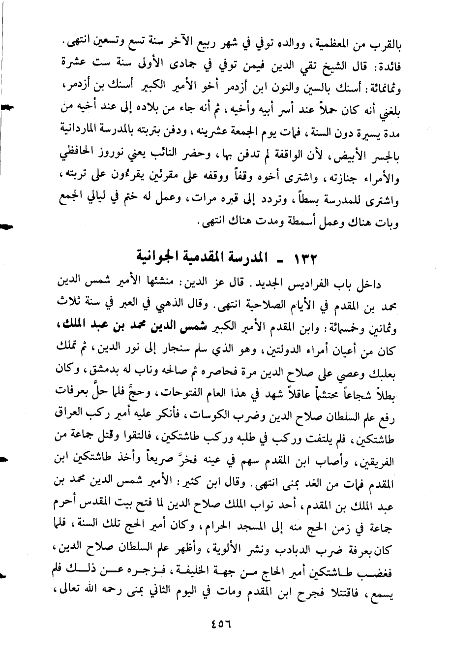 داخل باب الفراديس الجديد. قال عز الدين: منشئها الأمير شمس الدين محمد بن المقدم في الأيام الصلاحية انتهى. وقال الذهبي في العبر في سسنة ثلاث وثمانين وخمسمائة: وابن المقدم الأمير الكبير شمس الدين محمد بن عبد الملك كان من أعيان أمراء الدولتين وهو الذي سلم سنجار إلى نور الدين ثم تمل بعلبك وعصي علي صلاح الدين مرة فحاصره ثم صالحه وناب له دمشق وكان بطلا شجاعا محتشما عاقلا شهد في هذا العام الفتوحات وحج فلما حل بعرفات رفع علم السلطان صلاح الدين الدين وضرب الكوسات فأنكر عليه أمير ركب العراق طاشتكين فلم يلتفت وركب في طلبه وركب طاشتكين فالتقوا وقتل جماعة من الفريقين وأصاب ابن المقدم سهم في عينه فخر صريعا وأخذ طاشتكين ابن المقدم فمات من الغد بمنى انتهى. وقال ابن كثير الأمير شمس الدين محمد بن عبد الملك بن المقدم أحد نواب الملك صلاح الدين الدين لما فتح بيت المقدس أحرم جماعة في زمن الحج منه إلى المسجد الحرام وكان أمير الحج تلك السنة فلما كان بعرفة ضرب الدبادب ونشر الأولية وأظهر علم السلطان صلاح الدين فغضب طاشتكين أمير الحاج من جهة الخليفة فزجره عن ذلك فلم يسمه فاقتتلا فجرح ابن المقدم ومات في اليوم الثاني بمنى رحمه الله تعالى