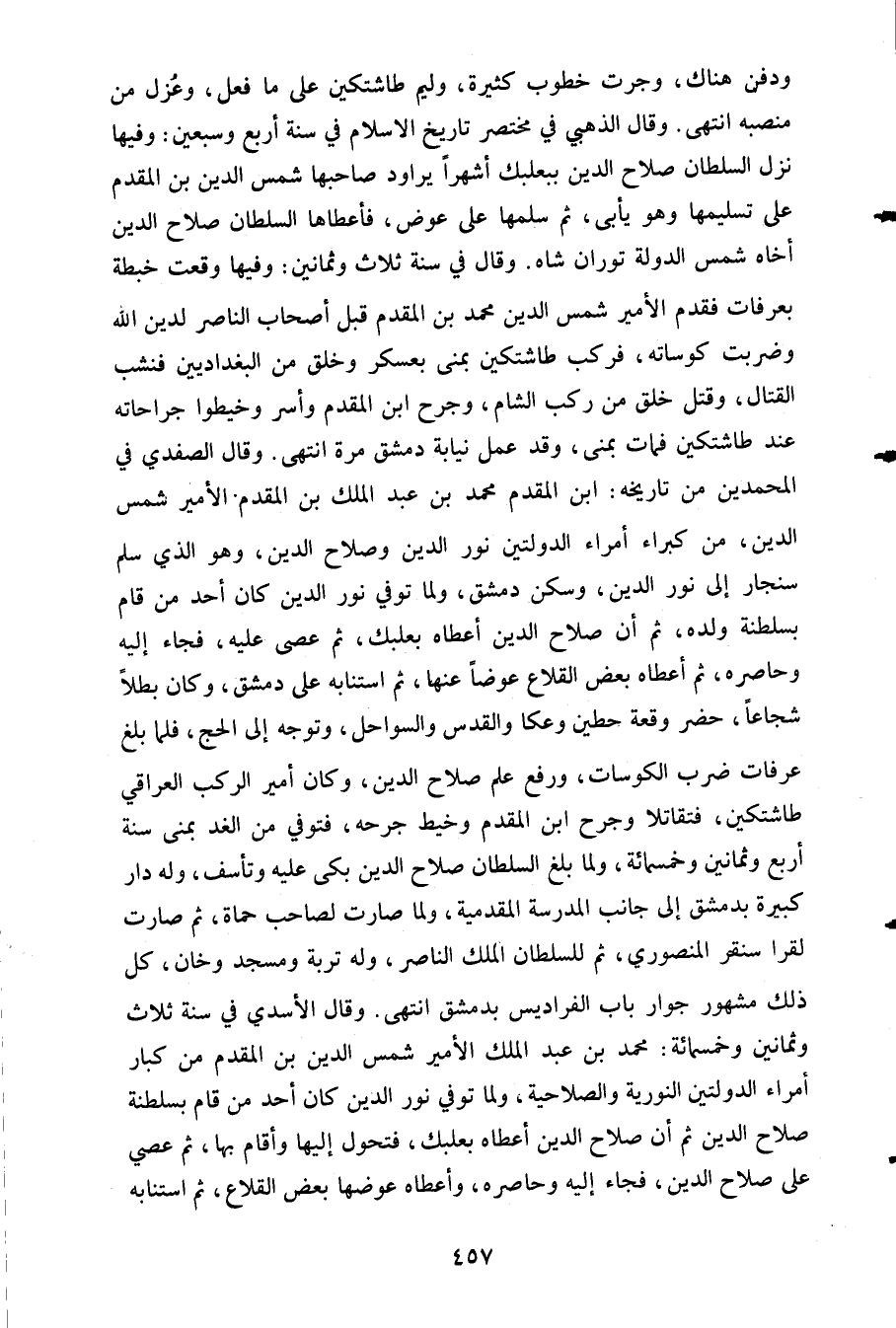 ودفن هناك وجرت خطوب كثيرة وليم طاشتكين على ما فعل وعزل من منصبه انتهى. وقال الذهبي في مختصر تاريخ الإسلام في سنة أربع وسبعين: وفيها نزل السلطان صلاح الدين ببعلبك أشهرا يراود صاحبها شمس الدين بن المقدم على تسليمها وهو يأبى ثم سلمها على عوض فأعطاها السلطان صلاح الدين أخاه شمس الدولة توران شاه وقال في سنة ثلاث وثمانين وفيها وقعت خبطة بعرفات فقدم الأمير شمس الدين محمد بن المقدم قبل أصحاب الناصر لدين الله وضربت كوساته فركب طاشتكين بمنى بعسكر وخلق من البغداديين فنشب القتال وقتل خلق من ركب الشام وجرح ابن المقدم وأسر وخيطوا جراحاته عند طاشتكين فمات بمنى وقد عمل نيابة دمشق مرة انتهى. وقال الصفدي في المحمدين من تاريخه: ابن المقدم محمد بن عبد الملك بن المقدم الأمير شمس الدين من كبراء أمراء الدولتين نور الدين وصلاح الدين وهو الذي سلم سنجار إلى نور الدين وسكن دمشق ولما توفي نور الدين كان أحد من قام بسلطنة ولده ثم أن صلاح الدين أعطاه بعلبك ثم عصى عليه فجاء إليه وحاصره ثم أعطاه بعض القلاع عوضا عنها ثم استنابه على دمشق وكان بطلا شجاعا حضر وقعة حطين وعكا والقدس والسواحل وتوجه إلى الحج فلما بلغ عرفات ضرب الكوسات ورفع علم صلاح الدين وكان أمير الركب العراقي طاشتكين فتقاتلا وجرح ابن المقدم وخيط جرحه فتوفي من الغد بمنى سنة أربع وثمانين وخمسمائة ولما بلغ السلطان صلاح الدين الدين بكى عليه وتأسف وله دار كبيرة بدمشق إلى جانب المدرسة المقدمية ولما صارت لصاحب حماة ثم صارت لقرا سنقر المنصوري ثم للسلطان الملك الناصر وله تربة ومسجد وخان كل ذلك مشهور جوار باب الفراديس بدمشق انتهى. وقال الأسدي في سنة ثلاث وثمانين وخمشمائة: محمد بن عبد الملك الأمير شمس الدين بن المقدم من كبار أمراء الدلتين النورية والصلاحية ولما توفي نور الدين كان أحد من قام بلسطنة صلاح الدين ثم أن صلاح الدين أعطاه بعلبك فتحول إليها وأقام بها ثم عصي على صلاح الدين فجاء إليه وحاصره وأعطاه عوضها بعض القلاع ثم استنابه