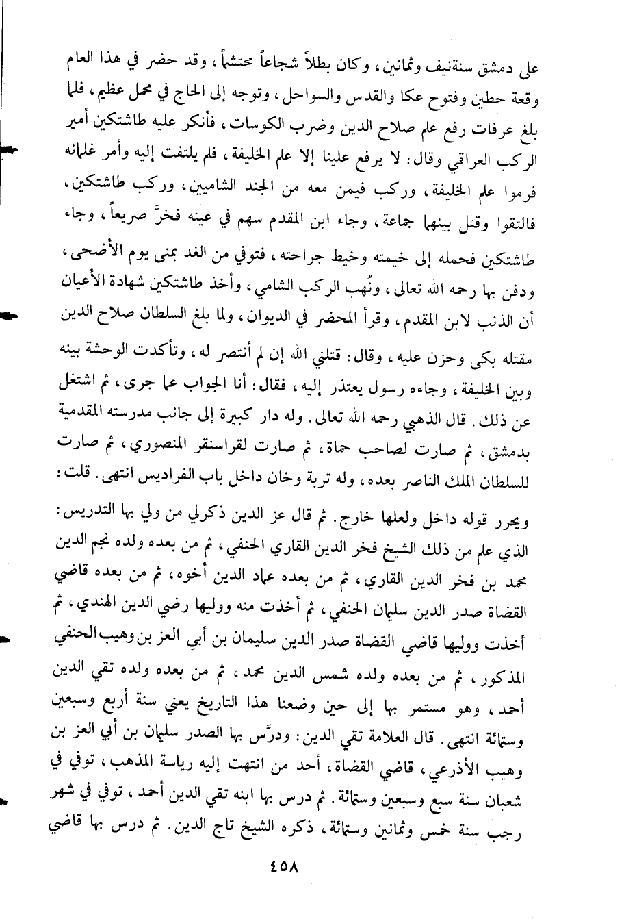 على دمشق سنة نيف وثمانين وكان بطلا شجاعا محتشما وقد حضر في هذا العام وقعة حطين وفتوح عكا والقدس والسواحل وتوجه إلى الحاج في محمل عظيم فلما بلغ عرفات رفع علم صلاح الدين وضرب الكوسات فأنكر عليه طاشتكان أمير الركب العراقي وقال لا يرفع علينا إلا علم الخليفة فلم يلتفت إليه وأمر غلمانه فرموا علم الخليفة وركب فيمن معه من الجند الشاميين وركب طاشتكين فالتقوا وقتل بينهما جماعة وجاء ابن المقدم سهم في عينه فخر صريعا وجاء طاشتكين فحمله إلى خيمته وخيط جراحته فتوفي من الغد بمنى يوم الأضحى ودفن بها رحمه الله تعالى ونهب الركب الشامي وأخذ طاشتكين شهادة الأعيان أن الذنب لابن المقدم وقرأ المحضر في الديوان ولما بلغ السلطان صلاح الدين مقلته بكى وحزن عليه وقال قتلني الله إن لم أنتصر له وتأكدت الوحشة بينه وبين الخليفة وجاءه رسول يعنذر إليه فقال أنا الجواب عما جرى ثم اشتغل عن ذلك. قال الذهبي رحمه الله تعالى: وله دار كبيرة إلى جانب مدرسته المقدمية بدمشق ثم صارت لصاحب حماة ثم صارت لقراسنقر المنصوري ثم صارت للسلطان الملك الناصر بعده وله تربة وخان داخل باب الفراديس انتهى. قلت: ويحرر قوله داخل ولعلها خارج. ثم قال عز الدين: ذكر لي من ولي بها التدريس الذي علم من ذلك الشيخ فخرالدين القاري ثم من بعده عمادالدين أخوه ثم من بعده قاضي القضاة صدر الدين سليمان الحنفي ثم أخذت منه ووليها رضي الدين الهندي ثم أخذت ووليها قاضي القضاة صدرالدين سليمان بن أبي العز بن وهيب الحفي المذكور ثم من بعده ولده شمس الدين محمد ثم من بعده ولده تقي الدين أحمد وهو مستمر بها إلى حين وضعنا هذا التاريخ يعني سنة أربع وسبعين وستمائة انتهى. قال العلامة تقي الدين: ودرس بها الصدر سليمان بن أبي العز بن وهيب الأذرعي قاضي القضاة أحد من انتهت إليه رياسة المذهب توفي في شعبان سنة سبع وسبعين وستمائة. ثم درس بها ابنه تقي الدين أحمد توفي في شهر رجب سنة خمس وثمانين وستمائة ذكره الشيخ تاج الدين. ثم درس بها قاضي
