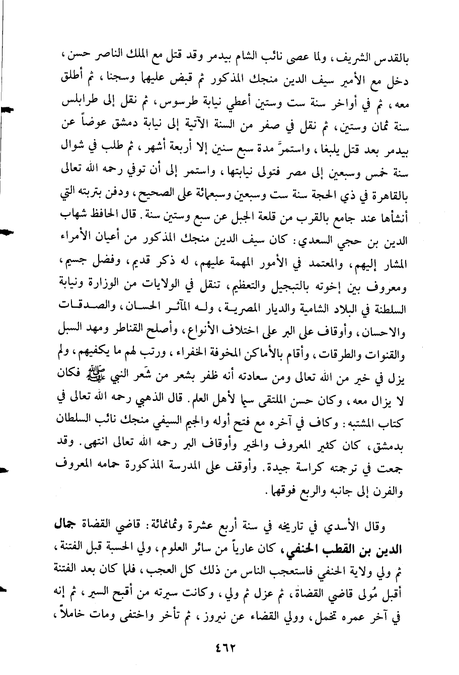 بالقدس الشريف ولما عصى نائب الشام بيدمر وقد قتل مع الملك الناصر حسن دخل مع الأمير سيف الدين منجك المذكور ثم قبض عليهما وسجنا ثم أطلق معه ثم في أواخر سنة ست وستين أعطي نيابة طرسوس ثم نقل إلى طرابلس سنة ثمان وستين ثم نقل في صفر من السنة الآتية إلى نيابة دمشق عوضا عن بيدمر بعد قتل يلبغا واستمر مدة سبع سنين إلا أربعة أشهر ثم طلب في شوال سنة خمس وسبعين إلى مصر فتولى نيابتها واستمر إلى أن توفي رحمه الله بالقاهرة في ذي الحجة سنة ست وسبعين وسبعمائة على الصحيح ودفن بتربته التي أنشأها عند جامع بالقرب من قلعة الجبل عن سبع وستين سنة. قال الحافظ شهاب الدين بن حجي السعدي: كان سيف الدين منجك المذكور من أعيان الأمراء المشار إليهم والمعتمد في الأمور المهمة عليهم له ذكر قديم وفضل جسيم ومعروف بين إخوته بالتبجيل والتعظيم تنقل في الولايات من الوزارة ونيابة السلطنة في البلاد الشامية والديار المصرية وله المآثر الحسان والصدقات والإحسان وأوقاف على البر على اختلاف الأنواع وأصلح القناطر ومهد السبل والقنوات والطرقات وأقام بالأماكن المخوفة الخفراء ورتب لهم ما يكفيهم ولم يزل في خير من الله تعالى ومن سعادته أنه ظفر بشعر من شعر النبي صلى الله عليه وآله وسلم فكان لا يزال معه وكان حسن الملتقى سيما لأهل العلم. قال الذهبي رحمه الله تعالى في كتاب المشتبه: وكاف في آخره مع فتح أوله والجيم السيفي منجك نائب السلطان بدمشق كان كثير المعروف والخير وأوقاف البر رحمه الله تعالى انتهى. وقد جمعت في ترجمته كراسة جيدة. وأوقف على المدرسة المذكورة حمامه المعروف والفرن إلى جانبه والربع فوقه.