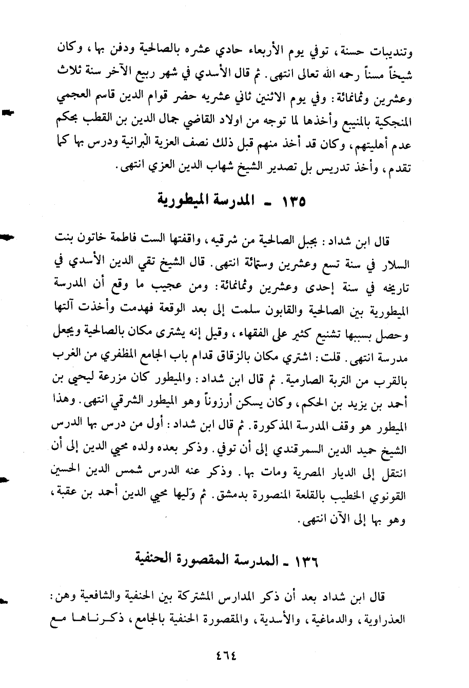 قال ابن شداد بعد أن ذرك المدارس المشتركة بين الحنفية والشافعية وهن: العذراوية والدماغية والأسدية والمقصورة الحنفية بالجامع ذكرناها مع