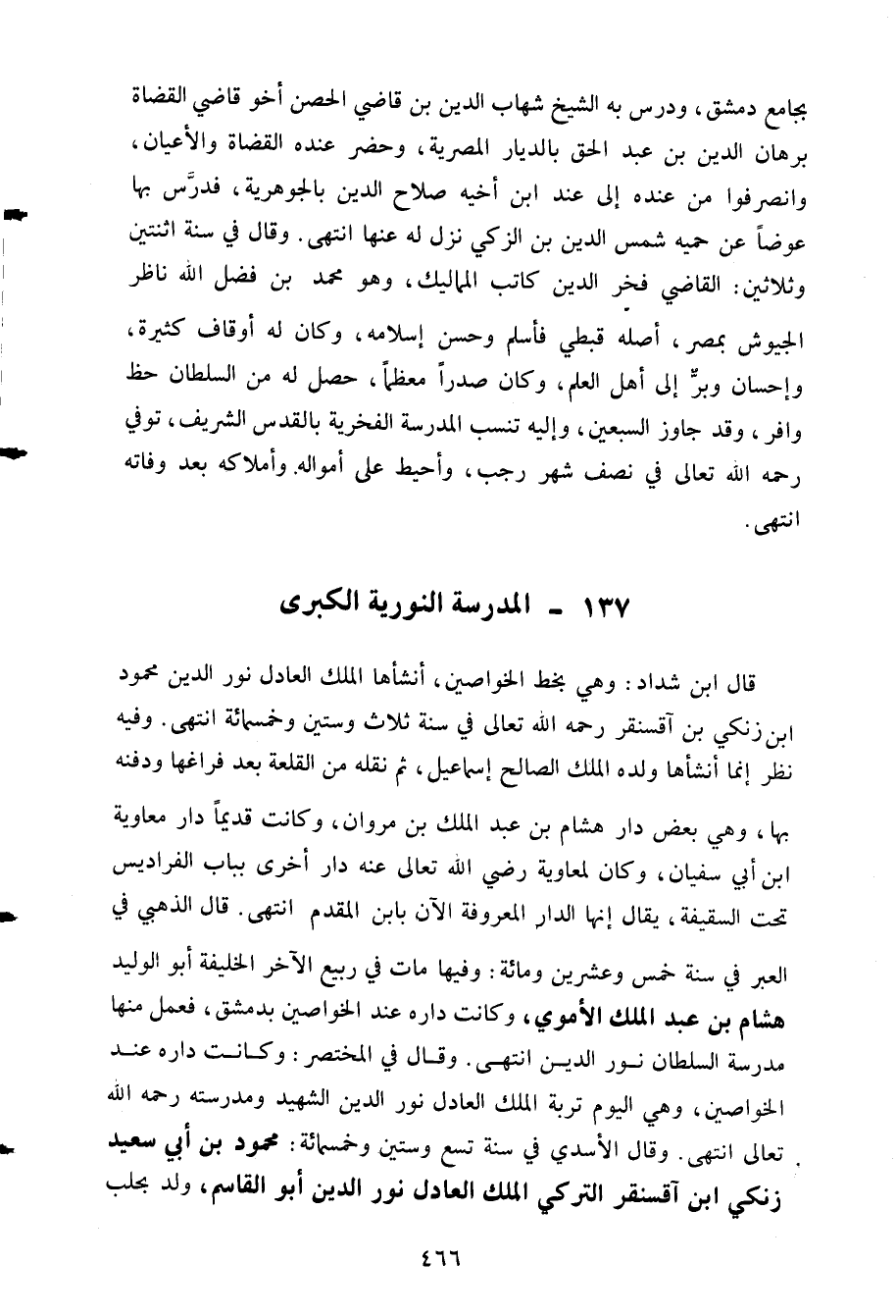 قال ابن شداد وهي بخط الخواصين أنشأها الملك العادل نور الدين محمود ابن زنكي بن آقسنقر رحمه الله تعالى في سنة ثلاث وستين وخمسمائة انتهى. وفيه نظر إنما أنشأها ولده الملك الصالح إسماعيل ثم نقله من القلعة بعد فراغها ودفنه بها وهي بعض دار هشان بن عبد الملك بن مروان وكانت قديما دار معاوية ابن أبي سفيان وكان لمعاوية رضي الله تعالى عنه دار أخرى بباب الفراديس تحت السقيفة يقال إنها الدار المعروفة الآن بابن المقدم انتهى. قال الذهبي في العبر في سنة خمس وعشرين ومائة: وفيها مات في ربيع الآخر الخليفة أبو الوليد هشام بن عبد الملك الأموي وكانت داره عند الخواصين بدمشق فعمل منها مدرسة السلطان نور الدين انتهى. وقال في المختصر: وكانت داره عند الخواصين وهي اليوم تربة الملك العادل نور الدين الشهيد ومدرسته رحمه الله تعالى انتهى. وقال الأسدي في سنة تسع وستين وخمسمائة: محمود بن أبي سعيد زنكي ابن آقسنقر التركي الملك العادل نور الدين أبو القاسم ولد بحلب