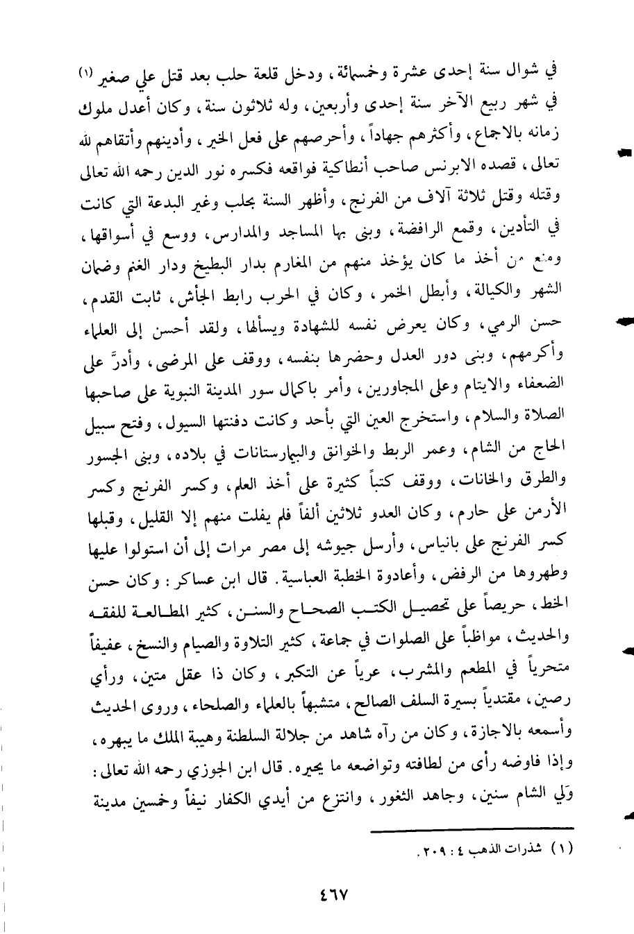 في شوال سنة إحدى عشرة وخمسمائة ودخل قلة حلب بعد قتل علي صغير1 في شهر ربيع الآخر سنة إحدى وأربعين وله ثلاثون سنة وكان أعدل ملوك زمانه بالإجماع وأكثرهم جهادا وأحرصهم على فعل الخير وأدينهم وأتقاهم لله تعالى قصده الإبرنس صاحب أنطاكية فواقعه فكسره نور الدين رحمه الله تعالى وقتله وقتل ثلاثة آلاف من الفرنج وأظهر السنة بحلب وغير البدعة التي كانت في التأدين وقمع الرافضة وبنى بها المساجد والمدارس ووسع في أسواقها ومنه من أخذ ما كان يؤخذ منهم من المغارم بدار البطيخ ودار الغنم وضمان الشهر والكيالة وأبطل الخمر وكان في الحرب رابط الجأش ثابت القدم حسن الرمي وكان يعرض نفسه للشهادة ويسألها ولقد أحسن إلى العلماء وأكرمهم وبنى دور العدل وحضرها بنفسه ووقف على المرضى وأدر على الضعفاء والأيتام وعلى المجاورين وأمر بإكمال سور المدينة النبوية على صاحبها الصلاة والسلام واستخرج العين التي بأحد وكانت دفنتها السيول وفتح سبيل الحاج من الشام وعمر الربط والخوانق والبيمارستانات في بلاده وبنى الجسور والطرق والخانات ووقف كتبا كثيرة على أخذ العلم وكسر الفرنج وكسر الأرمن على حارم وكان العدو ثلاثين ألفا فلم يفلت منهم إلا القليل وقبلها كسر الفرنج على بانياس وأرسل جيوشه إلى مصر مرات إلى أت استولوا عليها وطهروها من الرفض وأعادوا الخطبة العباسية. قال ابن عساكر: وكان حسن الخط حريصا على تحصيل الكتب الصحاح والسنن كثير المطالعة للفقه والحديث مواظبا على الصلوات في جماعة كثير التلاوة والصيام والنسخ عفيفا متحريا في المطعم والمشرب عريا عن التكبر وكان ذا عقل متين ورأي رصين متقديا بسيرة السلف الصالح متشبها بالعلماء والصلحاء وروى الحديث وأسمعه بالإجازة وكان من رآه شاهد من جلالة السلطنة وهيبة الملك ما يبهره وإذا فاوضه رأى من لطافته وتواضعه ما يحيره. قال ابن الجوزي رحمه الله تعالى: ولي الشام سنين وجاهد الثغور وانتزع من أيدي الكفار نيفا وخمسين مدينة