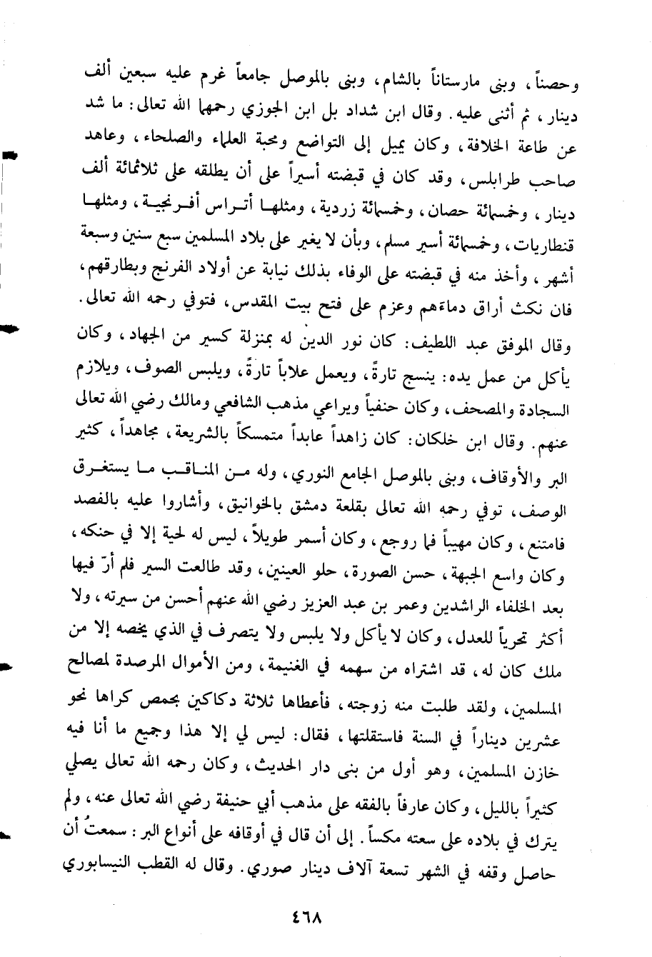 وحصنا وبنى مارستانا بالشام وبنى بالموصل جامعا غرم عليه سبعين ألف دينار ثم أثنى عليه. وقال ابن شداد: بل ابن الجوزي رحمهما الله تعالى ما شد عن طاعة الخلافة وكان يميل إلى التواضع ومحبة العلماء والصلحاء وعاهد صاحب طرابلس وقد كان في قبضته أسيرا على أن يطلقه على ثلاثمائة ألف دينار وخمسمائة حصان وخمسمائة زردية ومثلها أتراس أفرنجية ومثلها قنطاريات وخمسمائة أسير مسلم وبأن لا يغير على بلاد المسلمين سبع سنين وسبعة أشهر وأخذ منه في قبضته على الوفاء بذلك نيابة عن أولاد الفرنج وبطارقهم فإن نكث أراق دماءهم وعزم على فتح بيت المقدس فتوفي رحمه الله تعالى وقال الموفق عبد اللطيف كان نور الدين الدين له بمنزلة كسير من الجهاد وكان يأكل من عمل يده ينسج تارة ويعمل علابا تارة ويلبس الصوف ويلازم السجادة والمصحف وكان حنيفا ويراعي مذهب الشافعي ومالك رضي الله تعالى عنه عنهم وقال ابن خلكان كان زاهدا عابدا متمسكا بالشريعة مجاهدا كثير البر والأوقاف وبنى بالموصل الجامع النوري وله من المناقب ما يستغرق الوصف توفي رحمه الله تعالى بقلعة دمشق بالخوانيق وأشاروا عليه بالفصد فامتنع وكان مهيبا فما روجع وكان أسمر طويلا ليس له لحية إلا في حنكه وكان واسع الجبهة حسن الصورة حلو العينين وقد طالعت السير فلم أر فيها بعد الخلفاء الراشدين وعمر بن عبد العزيز رضي الله عنهم أحسن من سيريته ولا أكثر تحريا للعدل وكان لا يأكل ولا يلبس ولا يتصرف في الذي يخصه إلا من ملك كان له قد اشتراه من سهمه في الغنيمة ومن الأموال المرصدة لمصالح المسلمين ولقد طلبت منه زوجته فأعطاها ثلاثة دكاكين بحمص كراها نحو عشرين دينارا في السنة فاستقلتها فقال ليس لي إلا هذا وجميع ما أنا فيه خازن المسلمين وهو أول من بنى دار الحديث وكان رحمه الله تعالى يصلي كثيرا بالليل وكان عارفا بالفقه على مذهب أبي حنيفة رضي الله تعالى عنه ولم يترك في بلاده على سعته مكسا. إلى أن قال في أوقافه على أنواع البر سمعت أن حاصل وقفة في الشهر تسعة آلاف دينار صوري. وقال له القطب النيسابوري