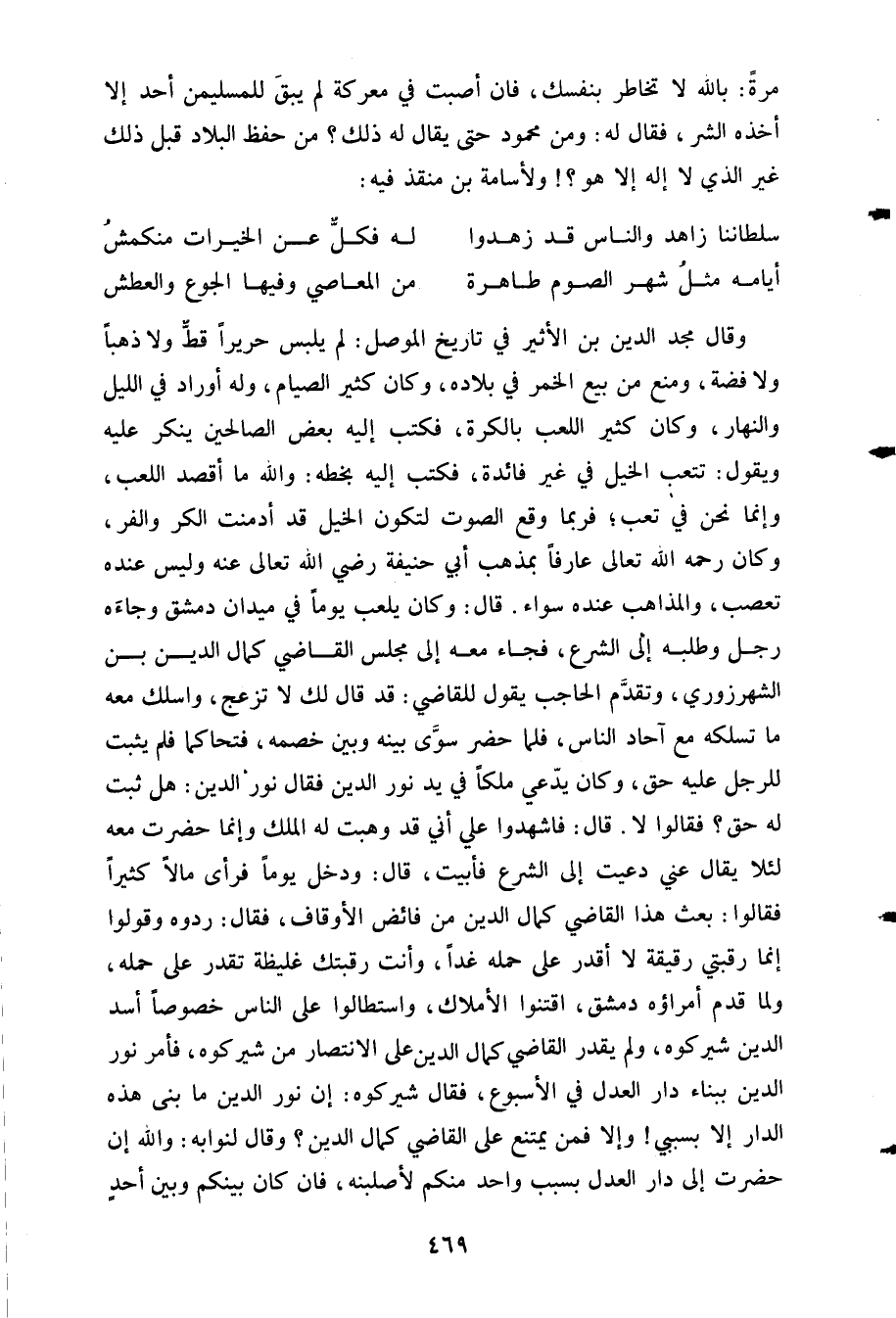 وقال مجد الدين بن الأثير في تاريخ الموصل: لم يلبس حريرا قط ولا ذهبا ولا فضة ومنع من بيع الخمر في بلاده وكان كثير الصيام وله أوراد في الليل والنهار وكان كثير اللعب بالكرة فكتب إليه بعض الصالحين ينكر عليه ويقول تتعب الخيل في غير فائدة فكتب إليه بخطه والله ما أقصد اللعب وإنما نحن في تعب فربما وقع والصوت لتكون الخيل قد أدمنت الكر والفر وكان رحمه الله تعالى عارفا بمذهب أبي حنيفة رضي الله تعالى عنه عنه ليس عنده تعصب والمذاهب عنده سواء. قال:وكان يلعب يوما في ميدان دمشق وجاءه رجل وطلبه إلى الشرع فجاء معه إلى مجلس القاضي كمال الدين بن الشهرزوري وتقدم الحاجب يقول للقاضي قد. قال: لك لا تزعج واسلك معه ما تسلكه مع آحاد الناس فلما حضر سوى بينه وبين خصمه فتحاكما فلم يثبت للرجل عليه حق وكان يدعي ملكا في يد نور الدين الدين فقال نور الدين هل ثبت له حق فقالوا لا. قال: فاشهدوا علي أني قد وهبت له الملك وإنما حضرت معه لئلا يقال عني دعيت إلى الشرع فأبيت. قال: ودخل يوما فرأى مالا كثيرا فقالوا بعث هذا القاضي كمال الدين من فائض الأوقاف فقال ردوه وقولوا إنما رقبتي رقيقة لا أقدر على حمله غدا وأنت رقبتك غليظة تقدر على حمله ولما قدم أمراؤه دمشق اقتنوا الأملاك واستطالوا على الناس خصوصا أسد الدين شيركوه ولم يقدر القاضي كمال الدين على الانتصار من شيركوه فأمر نور الدين ببناء دار العدل في الأسبوع فقال شيركوه: إن نور الدين الدين ما بنى هذه الدار إلا بسبي وإلا فمن يمتنع على القاضي كمال الدين؟ وقال لنوابه والله إن حضرت إلى دار العدل بسبب واحد منكم لأصلبنه فإن كان بينكم وبين أحد