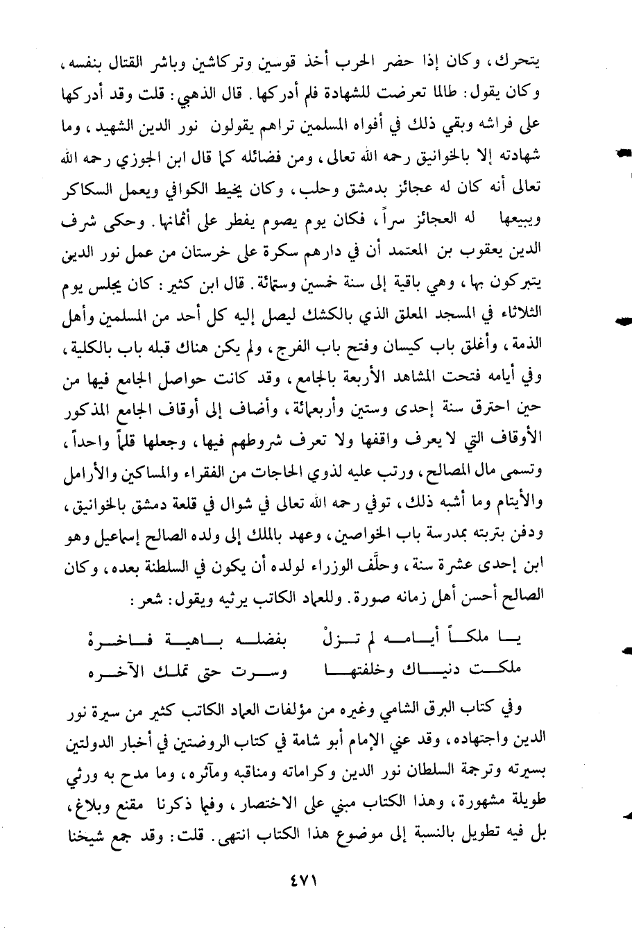 وفي كتاب البرق الشامي وغيره من مؤلفات العماد الكاتب كثير من سيرة نور الدين واجتهاده وقد عني الإمام أبو شامة في كتاب الروضتين في أخبار الدولتين بسيرته وترجمة السلطان نور الدين وكراماته ومناقبه ومآثره وما مدح به ورثي طويلة مشهور وهذا الكتاب مبني على الاختصار وفيما ذكرنا مقنع وبلاغ بل فيه تطويل بالنسبة إلى موضوع هذا الكتاب انتهى. قلت: وقد جمع شيخنا