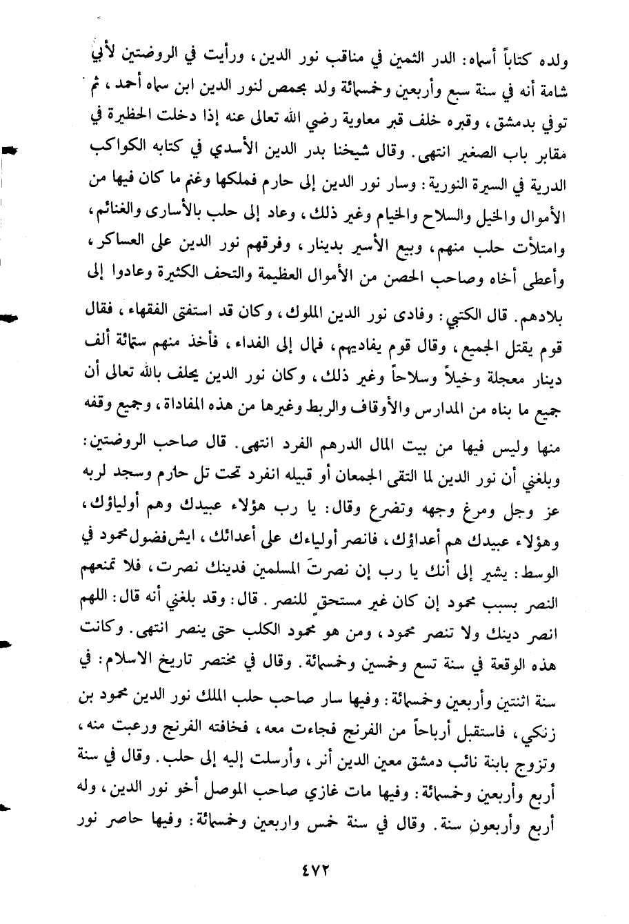 ولده كتبابا اسماه الدر الثمين في مناقب نورا لدين ورأيت في الوضتين لأبي شامه أنه في سنة سبع وأربعين وخمسمائة ولد بحمص لنور الدين ابن سماه أحمد ثم توف بدمشق وقبره خلف قبر معاوية رضي الله تعالى عنه إذا دخلت الحظيرة في مقابر باب الصغيرة انتهى. وقال شيخنا بدرا دلين الأسدي في كتابه الكواكب الدرية في السيرة النورية: وسار نور الدين الدين إلى حارم فملكها وغنم ما كان فيها من الأموال والخيل والسلاح والخيام وغير ذلك وعاد إلى حلب بالأسارى والغنائم وامتلأت حلب منهم وبيع الأسير بدينار وفرقهم نور الدين الدين على العساكر واعطى أخاه وصاحب الحصن من الأموال العظيمة والتحف الكثيرة وعادوا إلى بلادهم. قال الكتبي وفادي نور الدين الملوك وكان قد استفتى الفقهاء فقال قوم يقتل الجميع وقال قوم يفاديهم فمال إلى الفداء فأخذ منهم ستمائة ألف دينار معجلة وخيلا وسلاحا وغير ذلك وكان نور الدين يحلف بالله تعلا لا ان جميع ما بناه من المدارس والأوقاف والربط وغيرها من هذه المفاداة وجميع وقفه منها وليس فيها من بيت المال الدرهم الفرد انتهى. قال صاحب الروضتين وبلغني أن نور الدين لما إلتقى الجمعان أو قبيله انفرد تحت تل حارم وسجد لربه عزوجل ومرغ وجهه وتضرع وقال يا رب هؤلاء عبيدك وهم أولئك وهؤلاء عبيدك هم أعداؤك فانصر أولياءك على أعدائك إيش فضول محمود في الوسط يشير إلى أنك يا رب إن نصرت المسلمين فدينك نصرت فلا تمنعهم النصر بسبب محمود إن كان غير مستحق للنصر. قال وقد بلغني أنه قال: اللهم انصر دينك ولا تنصر محمود ومن هو محمود الكلب حتى ينصر انتهى. وكانت هذه الوقعة في سنة تسع وخمسين وخمسمائة وقال في مختصر تاريخ الإسلام في سنة اثنتين وأربعين وخمسمائة وفيها سار صاحب حلب الملك نور الدين محمود بن زنكي فاستقبل أرباحا من الفرنج فجاءت معه فاخفته الفرنج ورعبت منه وتزوج بابنة نائب دمشق معين الدين أنر وأرسلت إليه إلى حل وقال في سنة أربع وأربعين وخمسمائة وفيها مات غازي صاحب الموصل أخو نور الدين وله أربع وأربعون سنة. وقال في سنة خمس وأربعين وخمسمائة: وفيها حاصر نور