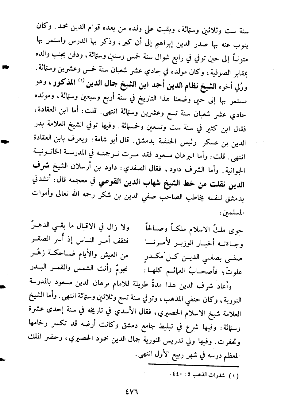 وأعاد شرف الدين هذا مدة طويلة للإمام برهان الدين مسعود بالمدرسة النورية وكان حنفي المذهب وتوفي سنة تسع وثلاثين وستمائة انتهى. وأما الشيخ العلامة شيخ الإسلام الحصيري فقال الأسدي في تاريخه في سنة إحدى عشرة وستمائة وفيها شرع في تبليط جامع دمشق وكانت أرضه في تكسر رخامها وتخفرت وفيها ولي تدريس النورية جمال الدين محمود الحصيري وحضر الملك المعظم درسه في شهر ربيع الأول انتهى.