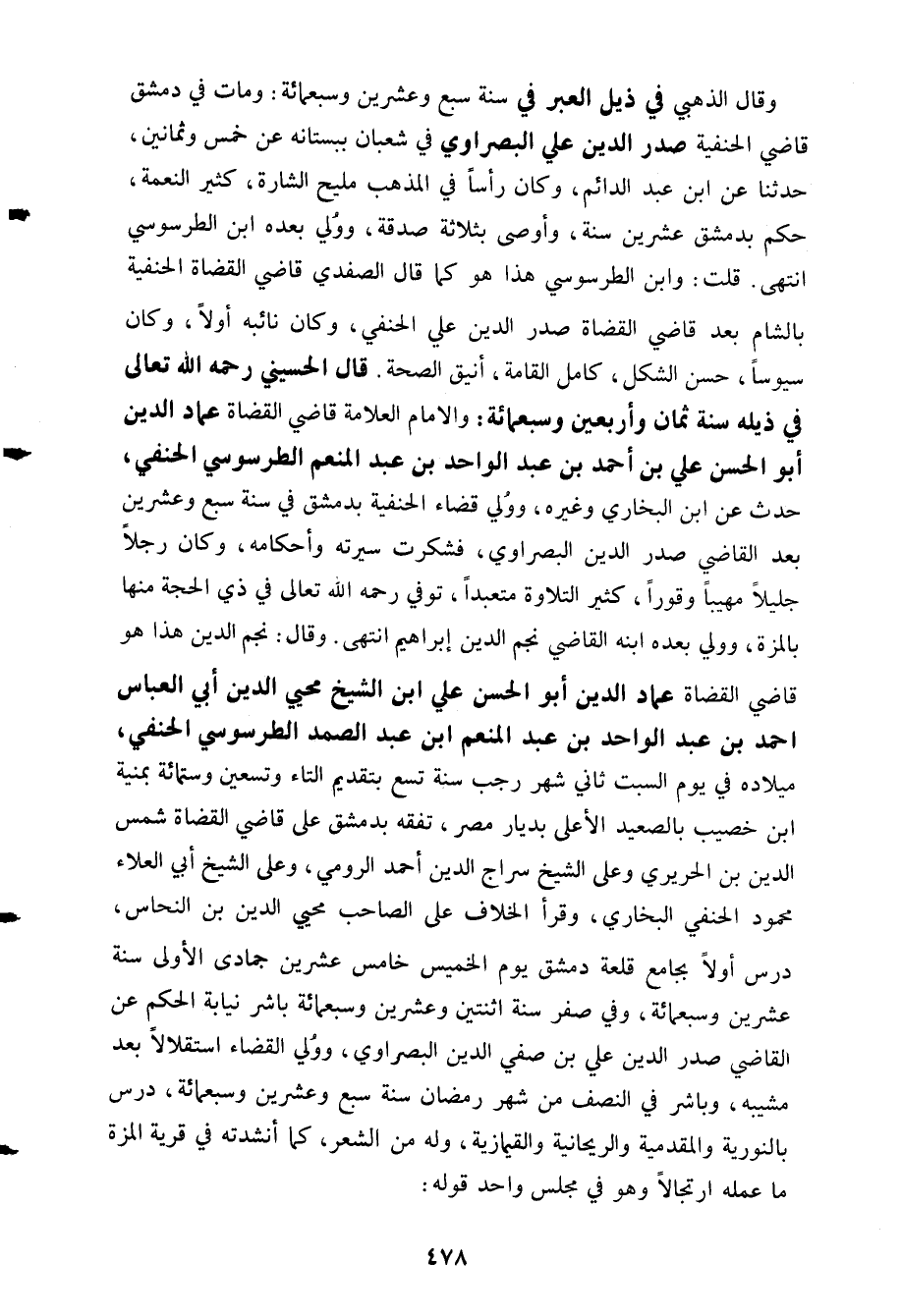 وقال الذهبي في ذيل العبر في سنة سبع وعشرين وسبعمائة ومات في دمشق قاضي الحنفية صدر الدين علي البصراوي في شعبان ببستانه عن خمس وثمانين حدثنا عن ابن عبد الدائم وكان رأسا في المذهب مليح الشارة كثير النعمة حكم بدمشق عشرين سنة وأوصى بثلاثة صدقة وولي بعده ابن الطرسوسي انتهى. قلت وابن طرسوسي هذا هو كما قال الصفدي قاضي القضاة الحنفية بالشام بعد قاضي القضاة صدر الدين علي الحنفي وكان نائبه أولا وكان سيوسا حسن الشكل كامل القامة أنيق الصحة قال الحسيني رحمه الله تعالى في ذيله سنة ثمان وأربعين وسبعمائة والامام العلامة قاضي القضاة عماد الدين أبو الحسن علي بن أحمد بن عبد الواحد بن عبد المنعم الطرسوسي الحنفي حدث عن ابن البخاري وغيره وولي قضاء الحنفية بدمشق في سنة سبع وعشرين بعد القاضي صدر الدين البصراوي فشكرت سيرته وأحكامه وكانرجلا جليلا مهيبا وقورا كثير التلاوة متعبدا توفي رحمه الله تعالى في ذي الحجة منها بالمزة وولي بعده ابنه القاضي نجم الدين إبراهيم انتهى وقال نجم الدين هذه هو قاضي القضاة عمادالدين أبو الحسن علي ابن الشيخ محيي الدين أبي العباس أحمد بن عبد الواحد بن عبد المنعم ابن عبد الصمد الطرسوسي الحنفي ميلاده في يوم السبت ثاني شهر رجب سنة تسع بتقديم التاء وتسعين وستمائة بمنية ابن خصيب بالصيعد الأعلى بديار مصر تفقه بدمشق على قاضي القضاة شمس الدين بن الحريري وعلى الشيخ سراج الدين أحمد الرومي وعلى الشيخ أبي العلاء محمود الحنفي البخاري وقرأ الخلاف على الصاحب محيي الدين بن النحاس درس أولا بجامع قلعة دمشق يوم الخمس خامس عشرين جمادى الأولى سنة عشرين وسبعمائة وفي صفر سنة اثنتين وعشرين وسبعمائة باشر نيابة الحكم عن القاضي صدر الدين علي بن صفي الدين البصراوي وولي القضاء استقلالا بعد مشيبه وباشر في النصف من شهر رمضان سنة سبع وعشرين وسبعمائة درس بالنورية والمقدمية والريحانية والقيمازية وله من الشعر كما أنشدته في قرية المزة ما عمله ارتجالا وهو في مجلس واحد قوله: