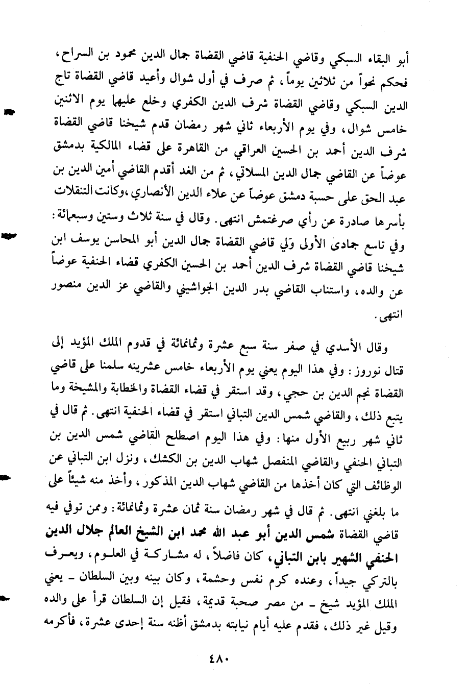 وقال الأسدي في صفر سنة سبع عشرة وثمانمائة: في قدوم الملك المؤيد إلى قتال نوروز وفي هذا اليوم يعني يوم الأربعاء خامس عشرينه سلمنا على قاضي القضاة نجم الدين بن حجي وقد استقر في قضاء القضاة والخطاة والمشيخة وما يتبع ذلك والقاضي شمس الدين التباني استقر في قضاء الحنفية انتهى. ثم قال في ثاني شهر ربيع الأول منها وفي هذا اليوم اصطلح القاضي شمس الدين بن التباني الحنفي والقاضي المنفصل شهاب الدين بن الكشك ونزل ابن التباني عن الوظائف التي كان أخذها من القاضي شهاب الدين المذكور وأخذ منه شيئا على ما بلغني انتهى. ثم قال في شهر رمضان سنة ثمان عشرة وثمانمائة: وممن توفي فيه قاضي القضاة شمس الدين أبو عبد الله محمد ابن الشيخ العالم جلال الدين الحنفي الشهير بابن التباني كان فاضلا له مشاركة في العلوم ويعرف بالتركي جيدا وعنده كرم الله تعالى وجهه نفس وحشمة وكان بينه وبين السلطان يعني الملك المؤيد شيخ من مصر صحبة قديمة فقيل إن السلطان قرأ على والده وقيل غير ذلك فقدم عليه أيام نيابته بدمشق أظنه سنة إحدى عشرة فأكرمه