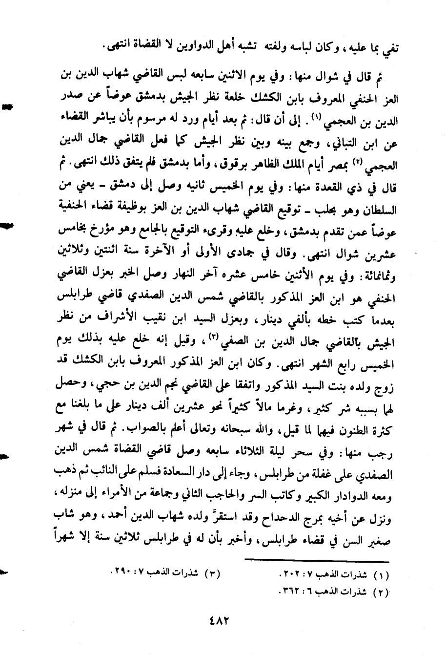 ثم قال في شوال منها: وفي يوم الإثنين سابعه لبس القاضي شهاب الدين بن العز الحنفي المعروف بابن الكشك خلعة نظر الجيش بدمشق عوضا عن صدر الدين بن العجمي1. إلى أن قال: ثم بعد أيام ورد له مرسوم بأن يباشر القضاء عن ابن التباني وجمع بينه وبين نظر الجيش كما فعل القاضي جمال الدين العجمي2 بمصر أيام الملك الظاهر برقوق وأما بدمشق فلم يتفق ذلك انتهى. ثم قال في ذي القعدة منها: وفي يوم الخميس ثانية وصل إلى دمشق يعني من السلطان وهو بحلب توقيع القاضي شهاب الدين بن العز بوظيفة قضاء الحنفية عوضا عمن تقدم بدمشق وخلع عليه وقرئ التوقيع بالجامع وهو مؤرخ بخامس عشرين شوال انتهى. وقال في جمادى الأولى أو الآخرة سنة اثنتين وثلاثين وثمانمائة: وفي يوم الإثنين خامس عشره آخر النهار وصل الخبر بعزل القاضي الحنفي هو ابن العز المذكور بالقاضي شمس الدين الصفدي قاضي طرابلس بدعما كتب خطه بألفي دينار وبعزل السيد ابن نقيب الأشراف من نظر الجيش بالقاضي جمال الدين بن الصفي3 وقيل إنه خلع عليه بذلك يوم الخميس رابع الشهر انتهى. وكان ابن العز المذكور المعروف بابن الشك قد زوج ولده بنت السيد المذكور واتفقا على القاضي نجم الدين بن حجي وحصل لهما بسببه شر كثير وغرما مالا كثيرا نحو عشرين ألف دينار على ما بلغنا مع كثرة الظنون فيهما لما قيل والله سبحانه وتعالى أعلم بالصواب. ثم قال في شهر رجب منها: وفي سحر ليلة الثلاثاء سابعه وصل قاضي القضاة شمس الدين الصفدي على غفلة من طرابلس وجاء إلى دار السعادة فسلم على النائب ثم ذهب ومعه الدوادار الكبير وكاتب السر والحاجب الثاني وجماعة من الأمراء إلى منزله ونزل عن أخيه بمرج الدحداح وقد استقر ولده شهاب الدين أحمد وهو شاب صغير السن في قضاء طرابلس واخبر بأن له في طرابلس ثلاثين سنة إلا شهرا