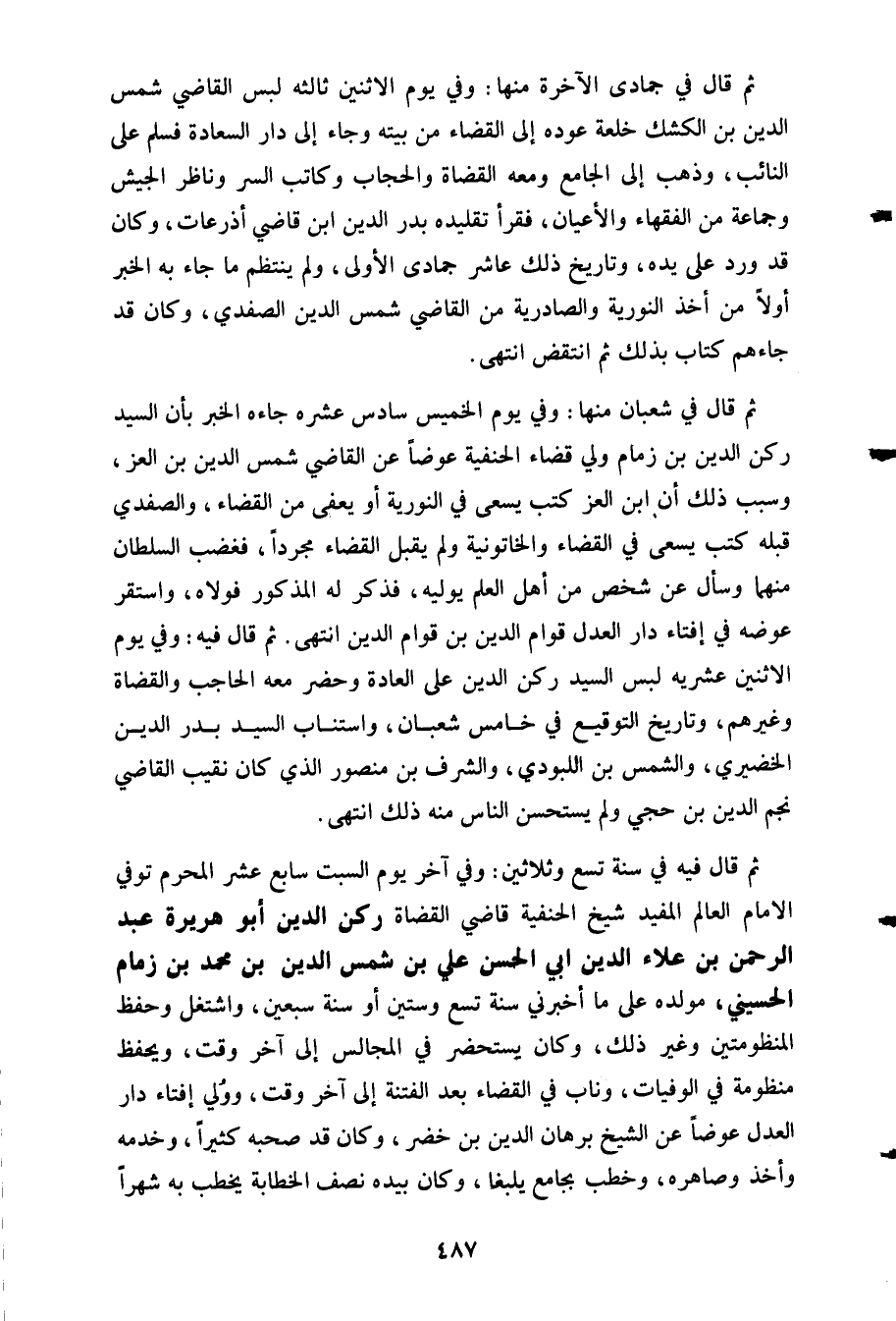 ثم قال في جمادى الآخرة منها: وفي يوم الإثنين ثالثه لبس القاضي شمس الدين بن الكشك خلعة عوده إلى القضاء من بيته وجاء إلى دار السعادة فسلم على النائب وذهب إلى الجامع ومعه القضاة والحجاب وكاتب السر وناظر الجيش وجماعة من الفقهاء والأعيان فقرأ تقليده بدر الدين ابن قاضي أذرعات وكان قد ورد على يده وتاريخ ذلك عاشر جمادى الأولى ولم ينتظم ما جاء به الخبر أولا من اذخذ النورية والصادرية من القاضي شمس الدين الصفدي وكان قد جاءهم كتاب بذلك ثم انتقض انتهى. ثم قال في شعبان منها: وفي يوم الخميس سادس عشره جاءه الخبر بأن السيد ركن الدين بن زمام ولي قضاء الحنفية عوضا عن القاضي شمس الدين بن العز وسبب ذلك ان ابن العز كتب يسعى في النورية أو يعفى من القضاء والصفدي قبله كتب يسعى في القضاء والخاتونية ولم يقبل القضاء مجردا فغضب السلكان منهما وسأل عن شخص من أهل العلم يوليه فذكر له المذكور فولاه واستقر عوضه في إفتاء دار العدل قوم الدين بن قوام الدين انتهى. ثم قال فيه وفي يوم الإثنين: عشريه لبس السيد ركن الدين على العادة وحضر معه الحاجب والقضاة وغيرهم وتاريخ التوقيع في خامس شعبان واستناب السيد بدر الدين الخضيري والشمس بن اللبودي والشرف بن منصور الذي كان نقيب القاضي نجم الدين بن حجي ولم يستحسن الناس منه ذلك انتهى.