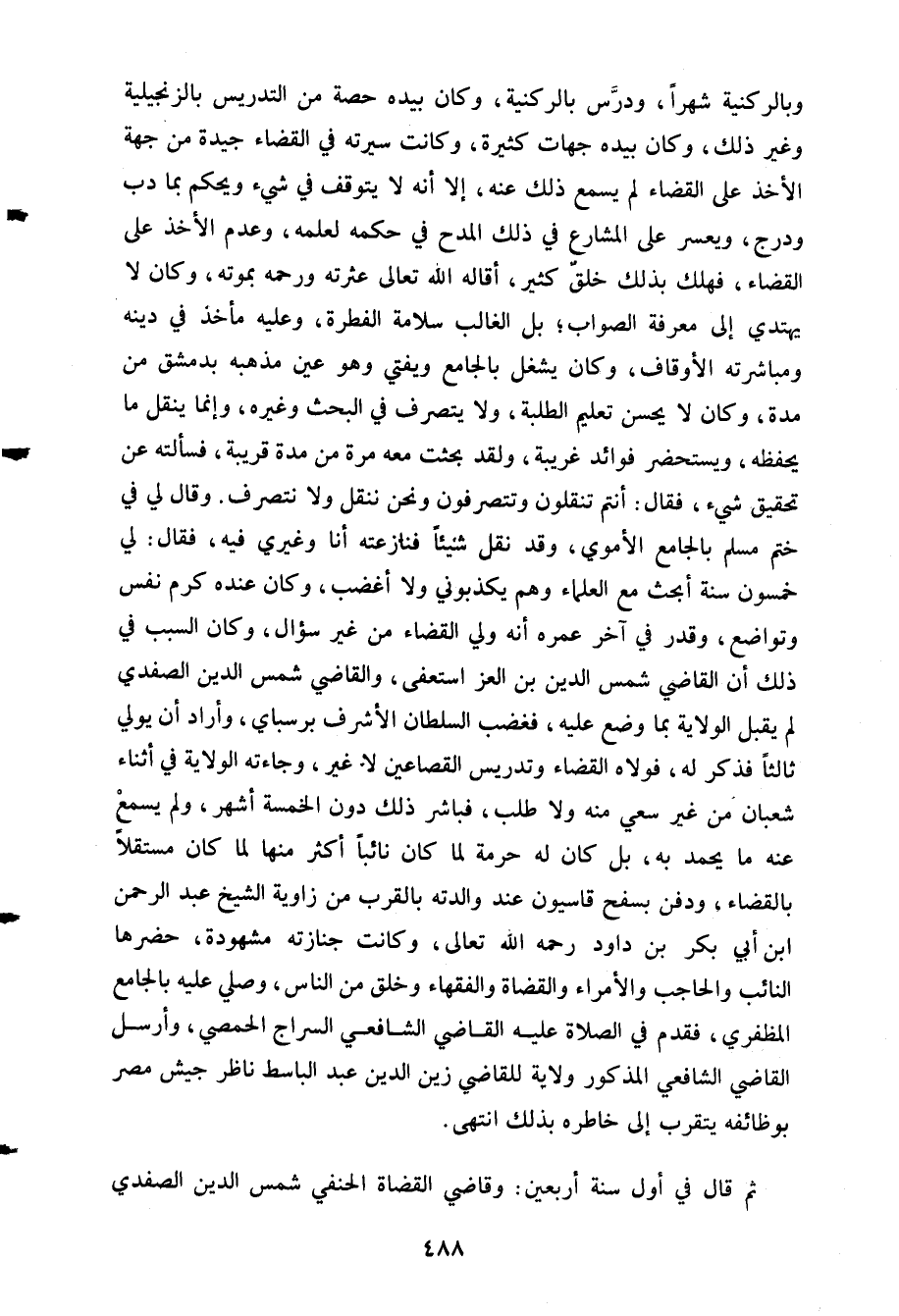 وبالركنية شهرا ودرس بالركنية وكان بيده حصة من التدريس بالزنجيلية وغيره ذلك وكان بيده جهات كثيرة وكانت سيرته في القضاء جيدة من جهة الأخذ على القضاء لم يسمع ذلك عنه إلا أنه لا يتوفق في شيء ويحكم بما دب ودرج ويعسر على المشارع في ذلك المدح في حكمة لعلمه وعدم الأخذ على القضاء فهلك بذلك خلق كثير أقاله الله تعالى عثرته ورحمه بموته وكان لا يهتدي إلى معرفة الصواب بل الغالب سلامة الفطرة وعليه مأخذ في دينه ومباشرته الأوقاف وكان يشغل بالجامع ويفتي وهو عين مذهبه بدمشق من مدة وكان لا يحسن تعليم الطلبة ولا يتصرف في البحث وغيره وإنما ينقلل ما يحفظه ويستحضر فوائد غريبة ولقد بحثت معه مرة من مدة قريبة فسألته عن تحقيق شيء فقال أنتم تنقلون وتتصرفون ونحن ننقل ولا نتصرف وقال للي في ختم مسلم بالجامع الأموي وقد نقل شيئا فنازعته أنا وغيري فيه فقال لي خمسون سنة أبحث مع العلماء وهم يكذبوني ولا أغصب وكان عنده كرم الله تعالى وجهه نفس وتواضع وقدر في آخر عمره أنه ولي القضاء من غيره سؤال وكان السبب في ذلك أن القاضي شمس الدين بن العز استعفى والقاضي شمس الدين الصفدي لم يقبل الولاية بما وضع عليه فغضب السلطان الأشرف برسباي وأراد أن يولي ثالثا فذكر له فولاه القضاء وتدريس القصاعين لا غير وجاءته الولاية في أثناء شعبان من غيره سعي منه ولا طلب فباشر ذلك دون الخمسة أشهر ولم يسمع عنه ما يحمد به بل كان له حرمة لما كان نائبا أكثر منها لما كان مستقلا بالقضاء ودفن بسفخ قاسيون عند والدته بالقرب من زاوية اللشيخ عبد الرحمن ابن أبي بكر بن داود رحمه الله تعالى وكانت جنازته مشهودة حضرها النائب والحاجب والأمراء والقضاة والفقهاء وخلق من الناس وصلي عليه بالجامع المظفري فقدم في الصلاة عليه القاضي الشافعي السراج الحمصي وأرسل القاضي الشافعي المذكور ولاية للقاضي زين الدين عبد الباسط ناظر جيش مصر بوظائفه يتقرب إلى خاطره بذلك انتهى.