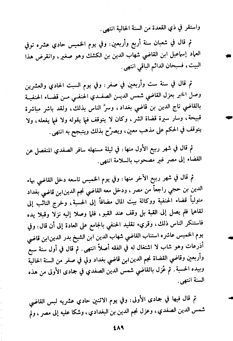 ثم قال في سنة ست وأربعين في صفر: وفي يوم السبت الحادي والعشرين وصل الخبر بعزل القاضي شمس الدين الصفدي الحنفي من القضاء الحنفية بالقاضي تاج الدين بن قاضي بغداد وسر الناس بذلك ولقد باشر مباشرة قبيحة وسار قضاة الشر وكان لا يتوقف فيما يقوله ولا فيما يفعله ولا يتوقف في الحكم على مذهب معين ويصرح بذلك ويتبجح به انتهى.