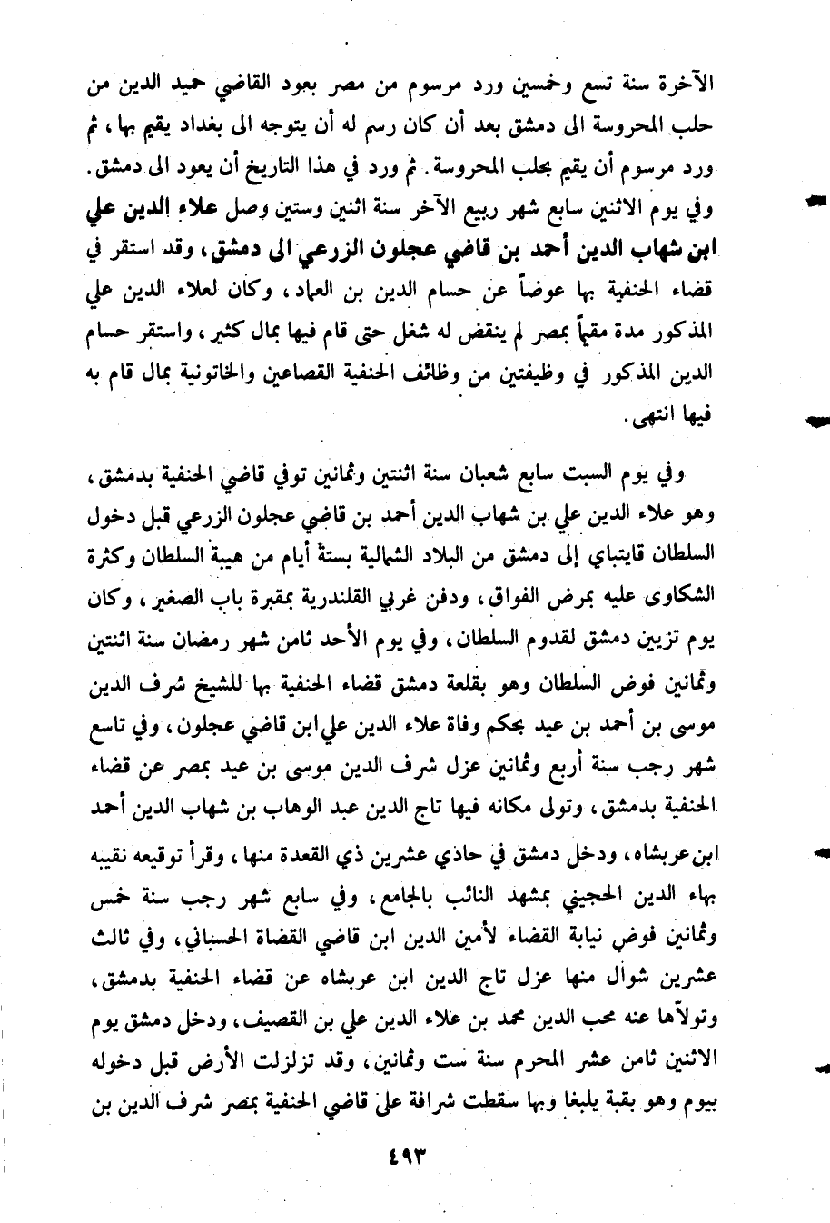 الآخرة سنة تسع وخمسين ورد مرسوم من مصر بعود القاضي حميد الدين من حلب المحروسة إلى دمشق بعد أن كان رسم له أن يتوجه إلى بغداد يقيم بها ورد مرسوم أن يقيم بحلب المحروسة ثم ورد في هذا التاريخ أن يعود إلى دمشق وفي يوم الإثنين سابع شهر ربيع الآخر سنة اثنين وستين وصل علاء الدين علي ابن شهاب الدين أحمد بن قاضي عجلون الزرعي إلى دمشق وقد استقر في قضاء الحنفية بها عوضا عن حسام الدين بن العماد وكان لعلاء الدين علي المذكور مدة مقيما بمصر لم ينقض له شغل حتى قام فيها بمال كثير واستقر حسام الدين المذكور في وظيفتين من وظائف الحنفية القصاعين والخاتونية بمال قام به فيها انتهى.