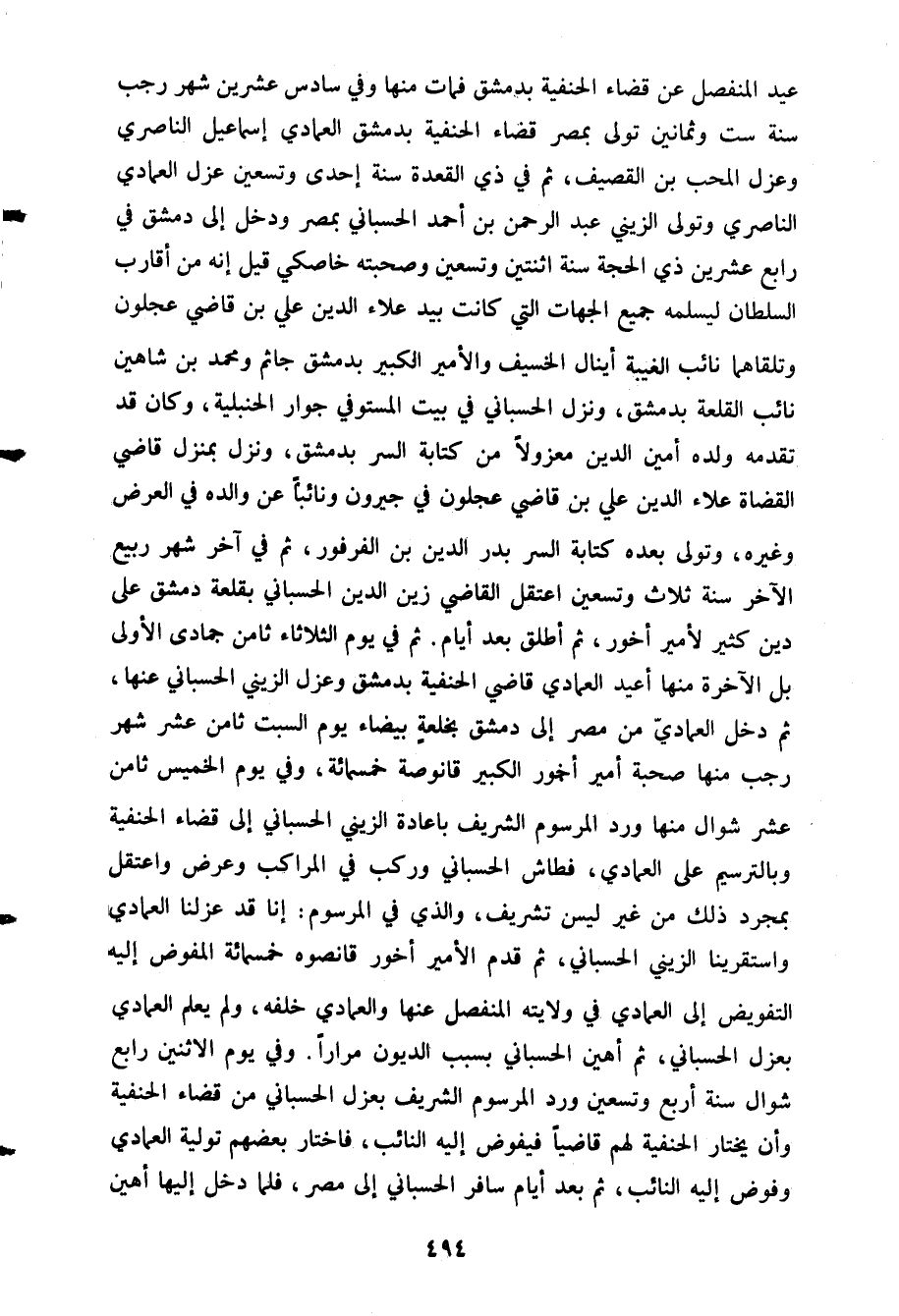 عبد المنفصل عن قضاء الحنفية بدمشق فمات منها وفي سادس عشرين شهر رجب سنة ست وثمانين تولى بمصر قضاء الحنفية بدمشق العمادي إسماعيل الناصري وعزل المحب بن القصيف ثم في ذي القعدة سنة إحدى وتسعين عزل العمادى الناصري وتولى الزيني عبد الرحمن بن أحمد الحسباني بمصر ودخل إلى دمشق في رابع عشرين ذي الحجة سنة اثنتين وتسعين وصحبته خصاكي قيل إنه من اقارب السلطان ليسلمه جميع الجهات التي كانت بيد علاء الدين بن قاض عجلون وتلقاهما نائب الغيبة أينال الخسيف والأمير الكبير بدمشق جاثم ومحمد بن شاهين نائب القلعة بدمشق ونزل الحسباني في بيت المستوفى جوار الحنبلية وكان قد تقدمه ولده أمين الدين معزولا من كتابة السر بدمشق ونزل بمنزل قاضي القضاة علاء الدين علي بن قاضي عجلون في جيرون ونائبا عن والده في العرض وغيره وتولى بعده كتابة السر بدر الدين بن الفرفور ثم في آخر شهر ربيع الآخر سنة ثلاث وتسعين اعتقل القاضي زين الدين الحسباني بقلعة دمشق على دين كثير لأمير أخور ثم أطلق بعد أيام ثم في يوم الثلاثاء ثامن جمادى الأولى بل الآخرة منها أعيد العمادي قاضي الحنفية بدمشق وعزل الزيني الحسباني عنها ثم دخل العمادي من مصر إلى دمشق بخلعة بيضاء يوم السبت ثامن عشر شهر رجب منها صحبة أمير أخور الكبير قانوصية خمسمائة وفي يوم الخميس ثامن عشر شوال منها ورد المرسوم الشريق بإعادة اليني الحسباني إلى قضاء الحنفية وبالترسيم على العمادي فطاش الحسباني وركب في المراكب وعرض واعتقل بمجرد ذلك من غير ليسن تشريف والذي في المرسوم إنا قد عزلنا العمادى واستقرينا الزيني الحسباني ثم قدم الأمير أخور قانصوه خمسمائة المفوض إليه التفويض إلى العمادي في ولايته المنفصل عنها والعمادي خلفه ولم يعلم العمادي بعزل الحسباني ثم أهين الحسباني بسبب الديون مرارا وفي يوم الإثنين رابع شوال سنة أربع وتسعين ورد المرسوم الشريف بعزل الحسباني من قضاء الحنفية وأن يختار الحنفية لهم قاضيا فيفوض إليه النائب فاختار بعضه تولية العمادى وفوض إليه النائب ثم بعد أيام سافر الحسباني إلى مصر فلما دخل إليها أهين