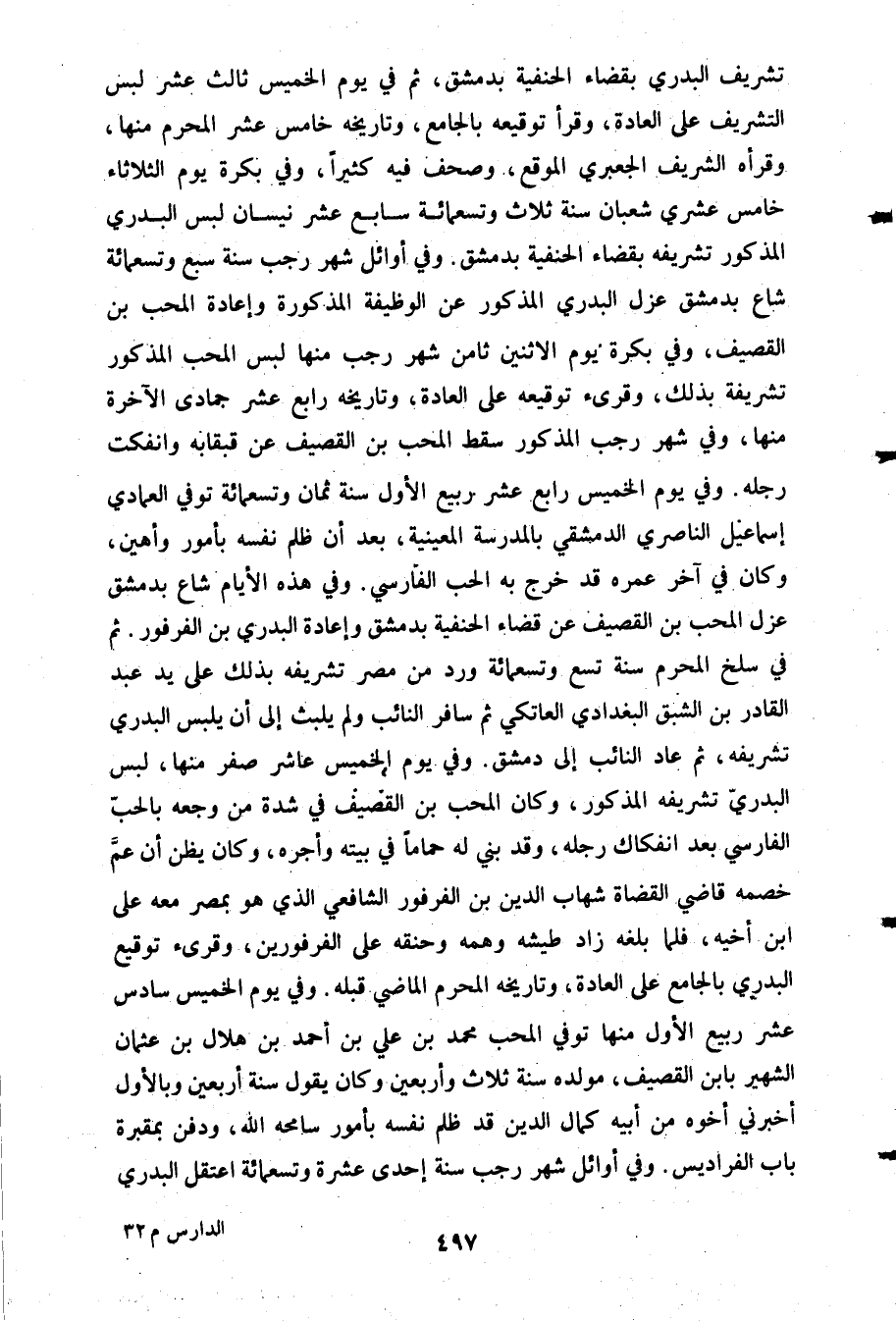 تشريف البدري بقضاء الحنفية بدمشق ثم في يوم الخميس ثالث عشر لبس التشريف على العادة وقرأ توقيعه بالجامع وتاريخه خامش عشر المحرم منها وقرأه الشريف الجعبري الموقع وصحف فيه كثيرا وفي بكرة يوم الثلاثاء خامس عشري شعبان سنة ثلاث وتسعمائة سابع عشر نيسان لبس البدري المذكور تشريفه بقضاء الحنفية بدمشق. وفي أوائل شهر رجب سنة سبع وتسعمائة شاع بدمشق عزل البدري المذكور عن الوظيفة المذكورة وإعادة المحب بن القصيف وفي بكرة يوم الإثنين ثامن شهر رجب منها لبس المحب المذكور تشريفة بذلك وقرئ توقيعه على العادة وتريخه رابع عشر جمادى الآخرة منها وفي شهر رجب المذكور سقط المحب بن القصيف عن قبقابه وانفكت رجله وفي يوم الخميس رابع عشر ربيع الأول سنة ثمان وتسعمائة توفي العمادي إسماعيل النصاري الدمشقي بالمدرسة المعينية بعد أن ظلم نفسه بأمور وأهين وكان في آخر عمره قد خرج به الحب الفارسي وفي هذه الايام شاع بدمشق عزل المحب بن القصيف عن قضاء الحنفية بدمشق وإعادة البدري بن الفرفور ثم في سلخ المحرم سنة تسع وتسعمائة ورد من مصر ترشيفه بذلك على يد عبد القادر بن الشبق البغدادي العاتكي ثم سافر النائب ولم يلبث إلى أن يلبس البدري تشريفه ثم عاد النائب إلى دمشق وفي الخميس عاشر صفر منها لبس البدري تشريفه المذكور وكان المحب بن القصيف في شدة من وجعه بالحب الفارسي بعد انفكاك رجله وقد بني له حماما في بيته واجره وكان يظن أن عم خصمه قاضي القضاة شهاب الدين بن الفرفور الشافعي الذي هو بمصر معه على ابن أخيه فلما بلغه زاد طيشه وهمه وحنقه على الفرفورين وقرئ توقيع البدري بالجامع على العادة وتاريخه المحرم الماضي قبله وفي يوم الخميس سادس عشر ربيع الأول منها توفي المحب محمد بن علي بن أحمد بن هلال بن عثمان الشهير بابن القصيف مولده سنة ثلاث وأربعين وكان يقول سنة أربعين وبالأول أخبرني أخوه من أبيه كمال الدين قد ظلم نفسه بأمور سامحه الله ودفن بمقبرة باب الفراديس. وفي أوائل شهر رجب سنة إحدى عشرة وتسعمائة اعتقل البدري