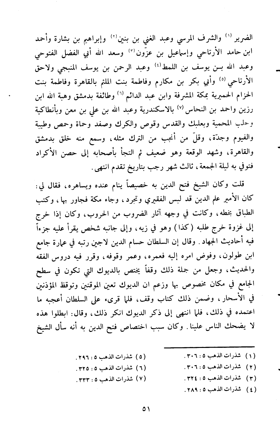 قلت وكان الشيخ فتح الدين به خصيصا ينام عنده ويساهره فقال لي: كان الامير علم الدين قد لبس الفقيري وتجرد وجاء مكة فجاور بها وكتب الطباق بخطه وكانت في وجهة آثار الضروب من الحروب وكان إذا خرج إلى غزوة خرج طلبة كذا وهو في زيه وإلى جانبه شخص يقرأ عليه جزءا فيه أحاديث الجهاد وقال: إن السلطان حسام الدين لاجين رتبه في عمارة جامع ابن طولون وفوض أمره إليه فعمره وعمر وقوفه وقرر فيه دروس الفقه والحديث وجعل من جملة ذلك وقفا يختص بالديوك التي تكون في سطح الجامع في مكان مخصوص بها وزعم ان الديوك تعين الموقتين وتوقظ المؤذنين في الاسحار وضمن ذلك كتاب وقف فلما قرئ على السلطان أعجبه ما اعتمده في ذلك فلما انتهى إلى ذكر الديوك أنكر ذلك وقال: ابطلوا هذه لا يضحك الناس علينا وكان سبب أختصاص فتح الدين به أنه سأل الشيخ.