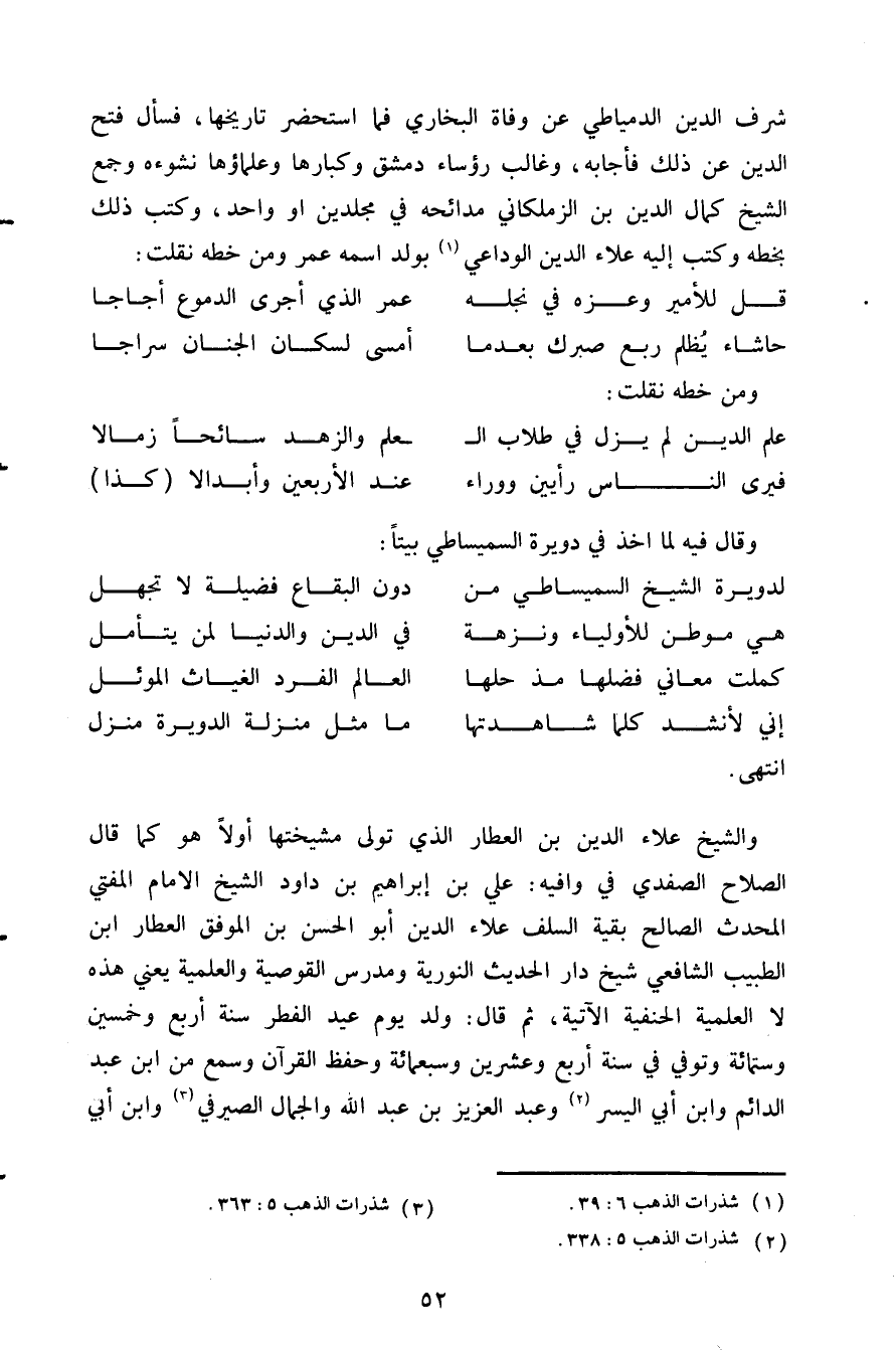 شرف الدين الدمياطي عن وفاة البخاري فلما استحضر تاريخها فسأل فتح الدين عن ذلك فأجابه وغالب رؤساء دمشق وكبارها وعلماؤها نشوءه وجمع الشيخ كمال الدين بن الزملكاني مدائحه في مجلدين أو واحد وكتب ذلك بخطه وكتب إليه علاء الدين الوداعي1 بولد أسمه عمر ومن خطه نقلت: