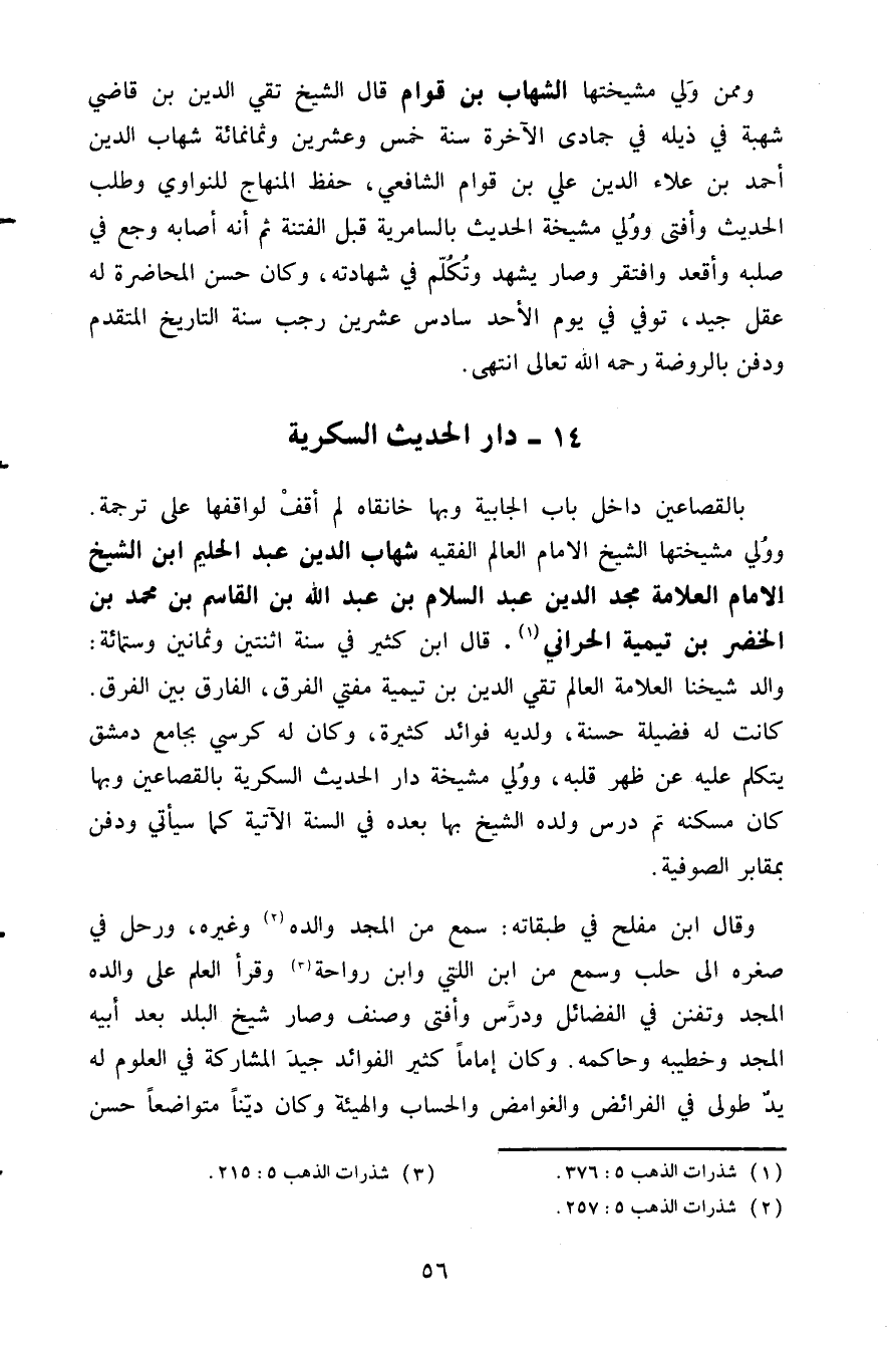 بالقصاعين داخل باب الجابية وبها خانقاه لم أقف لواقفها على ترجمة وولي مشيختها الشيخ الإمام العالم الفقيه شهاب الدين عبد الحليم ابن الشيخ الإمام العلامة مجد الدين عبد السلام بن عبد الله بن القاسم بن محمد بن الخضر بن تيمية الحراني1. قال ابن كثير في سنة اثنتين وثمانين وستمائة: والد شيخنا العلامة العالم تقي الدين بن تيمية مفتي الفرق الفارق بين الفرق كانت له فضيلة حسنة ولديه فوائد كثيرة وكان له كرسي بجامع دمشق يتكلم عليه عن ظهر قلبه وولي مشيخة دار الحديث السكرية بالقصاعين وبها كان مسكنة تم درس ولده الشيخ بها بعده في السنة الآتية كما سيأتي ودفن بمقابر الصوفية.