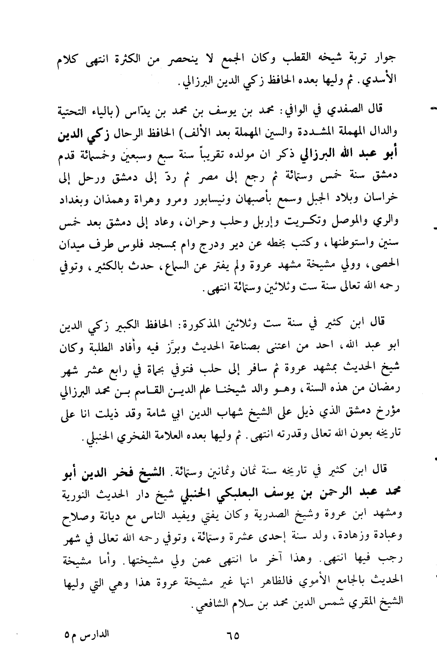 قال ابن كثير في سنة ست وثلاثين المذكورة: الحافظ الكبير زكي الدين أبو عبد الله احد من اعتنى بصناعة الحديث وبرز فيه وأفاد الطلبة وكان شيخ الحديث بمشهد عروة ثم سافر إلى حلب فتوفي بحماة في رابع عشر شهر رمضان من هذه السنة وهو والد شيخنا علم الدين القاسم بن محمد البرزالي مؤرخ دمشق الذي ذيل على الشيخ شهاب الدين أبي شامة وقد ذيلت انا على تاريخه بعون الله تعالى وقدرته انتهى. ثم وليها بعده العلامة الفخري الحنبلي.