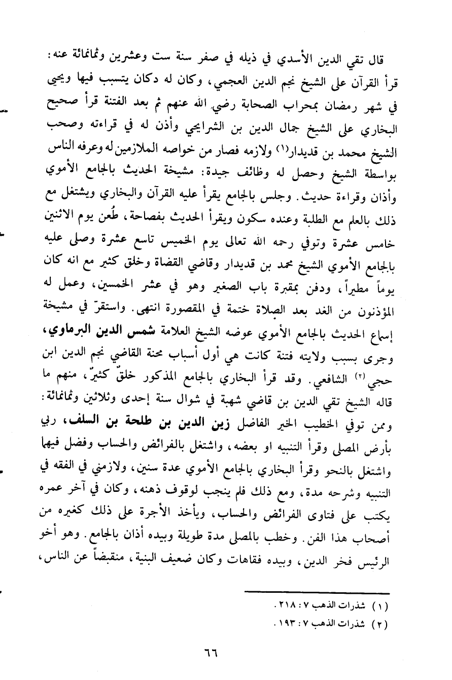قال تقي الدين الأسدي في ذيله في صفر سنة ست وعشرين وثمانمائة عنه: قرأ القرآن على الشيخ نجم الدين العجمي وكان له دكان يتسبب فيها ويحيى في شهر رمضان بمحراب الصحابة رضي الله عنهم ثم بعد الفتنة قرأ صحيح البخاري على الشيخ جمال الدين بن الشرايحي وأذن له في قراءته وصحب الشيخ محمد بن قديدار1 ولازمه فصار من خواصه الملازمين له وعرفه الناس بواسطة الشيخ وحصل له وظائف جيدة مشيخة الحديث بالجامع الأموي وأذان وقراءة حديث وجلس بالجامع يقرأ عليه القرآن والبخاري ويشتغل مع ذلك بالعلم مع الطلبة وعنده سكون ويقرأ الحديث بفصاحة طعن يوم الاثنين خامس عشرة وتوفي رحمه الله تعالى يوم الخميس تاسع عشرة وصلى عليه بالجامع الأموي الشيخ محمد بن قديدار وقاضي القضاة وخلق كثير مع أنه كان يوما مطيرا ودفن بمقبرة باب الصغير وهو في عشر الخمسين وعمل له الؤذنون من الغد بعد الصلاة ختمة في المقصورة انتهى واستقر في مشيخة إسماع الحديث بالجامع الأموي عوضه الشيخ العلامة شمس الدين البرماوي وجرى بسبب ولايته فتنة كانت هي أول أسباب محنة القاضي نجم الدين ابن حجي2 الشافعي وقد قرأ البخاري بالجامع المذكور خلق كثير منهم ما قاله الشيخ تقي الدين بن قاضي شهبة في شوال سنة إحدى وثلاثين وثمانمائة وممن توفي الخطيب الخير الفاضل زين الدين بن طلحة بن السلف ربي بأرض المصلى وقرأ التنبيه أو بعضه واشتغل بالفرائض والحساب وفضل فيهما واشتغل بالنحو وقرأ البخاري بالجامع الأموي عدة سنين ولازمني في الفقه في التنبيه وشرحه مدة ومع ذلك فلم ينجب لوقوف ذهنه وكان في آخر عمره يكتب على فتاوى الفرائض والحساب ويأخذ الأجرة على ذلك كغيره من أصحاب هذا الفن وخطب بالمصلى مدة طويلة وبيده أذان بالجامع وهو أخو الرئيس فخر الدين وبيده فقاهات وكان ضغيف البنية منقبضا عن الناس،