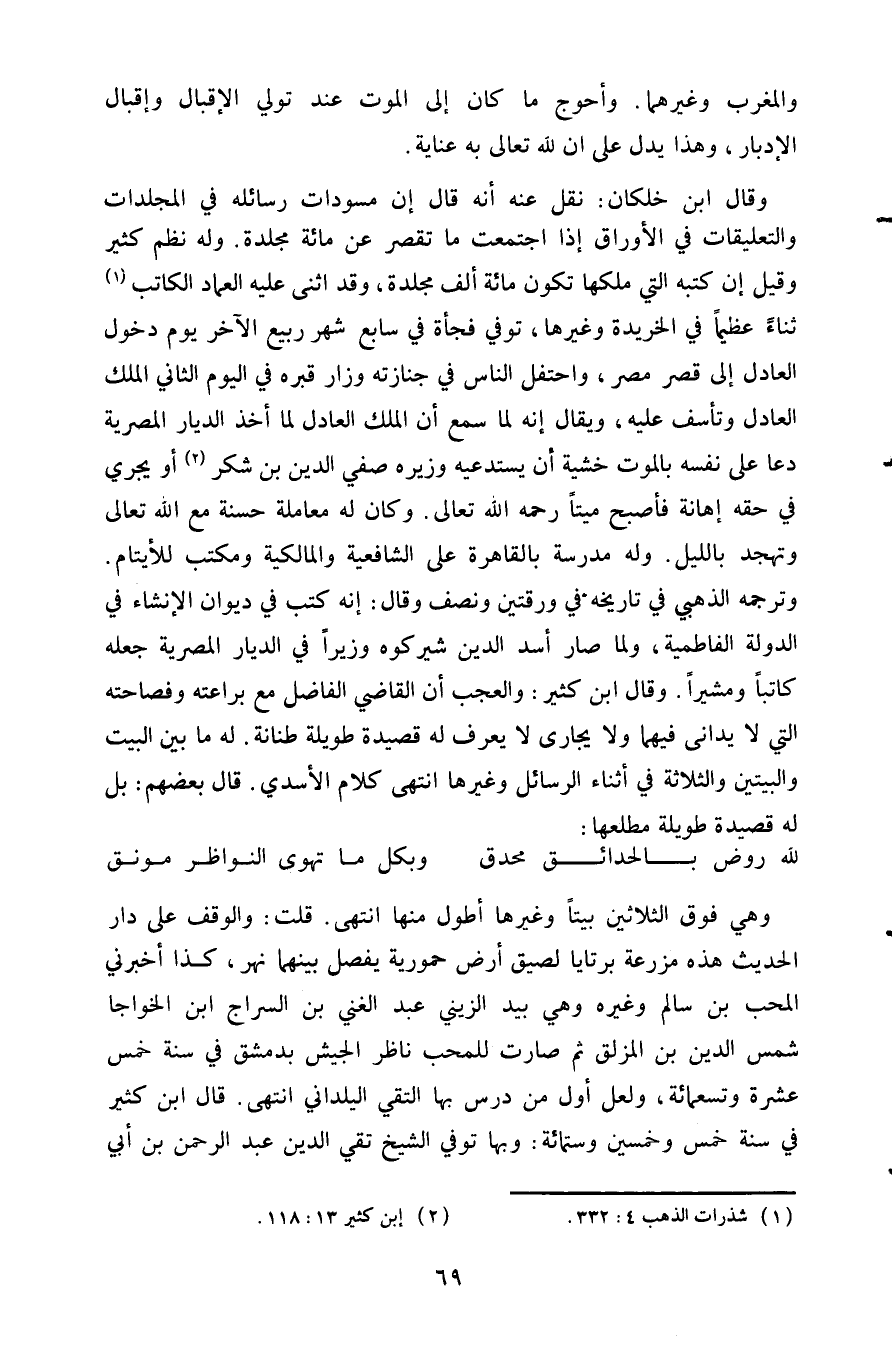 وقال ابن خلكان: نقل عنه أنه قال أن مسودات رسائله في المجلدات والتعليقات في الأوراق إذا اجتمعت ما تقصر عن مائة مجلدة وله نظم كثير وقيل أن كتبه التي ملكها تكون مائة ألف مجلدة. وقد اثنى عليه العماد الكاتب1 اثناء عظيما في الخريدة وغيرها توفي فجأة في سابع شهر ربيع الآخر يوم دخول العادل إلى قصر مصر واحتفل الناس في جنازته وزار قبره في اليوم الثاني الملك العادل وتأسف عليه ويقال أنه لما سمع أن الملك العادل لما أخذ الديار المصرية دعا على نفسه بالموت خشية أن يستدعيه وزيره صفي الدين بن شكر2 أو يجري في حقه إهانة فأصبح ميتا رحمه الله تعالى وكان له معاملة حسنة مع الله تعالى وتهجد بالليل وله مدرسة بالقاهرة على الشافعية والمالكية ومكتب للأيتام وترجمه الذهبي في تاريخه في ورقتين ونصف وقال: إنه كتب في ديوان الإنشاء في الدولة الفاطمية ولما صار أسد الدين شيركوه وزيرا في الديار المصرية جعله كاتبا ومشيرا وقال ابن كثير: والعجب أن القاضي الفاضل مع براعته وفصاحته التي لا يداني فيهما ولا يجارى لا يعرف له قصيده طويلة طنانة له ما بين البيت والبيتين والثلاثة في أثناء الرسائل وغيرها انتهى كلام الأسدي. قال بعضهم: بل له قصيدة طويلة مطلعها: