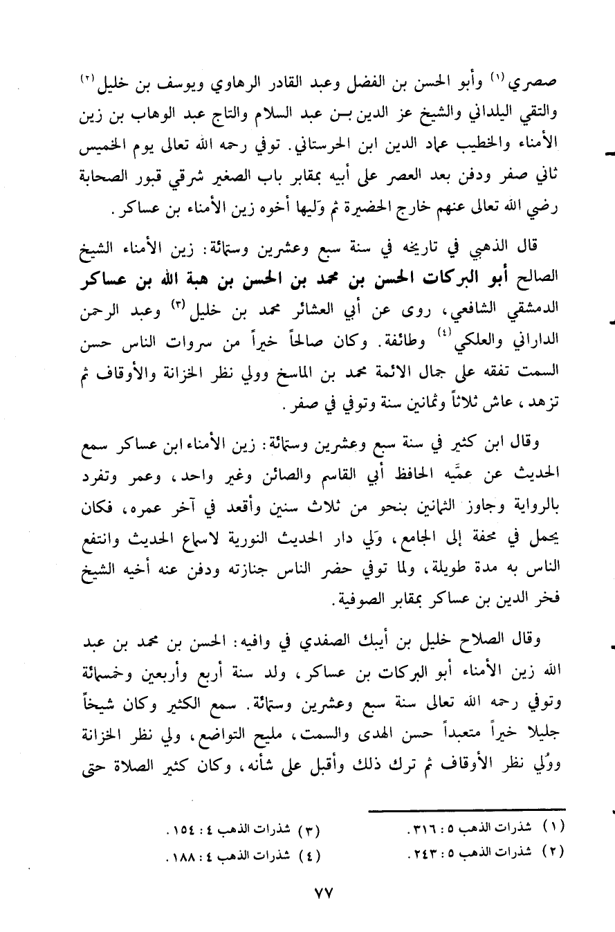 قال الذهبي في تاريخه في سنة سبع وعشرين وستمائة: زين الأمناء الشيخ الصالح أبو البركات الحسن بن محمد بن الحسن بن هبة الله بن عساكر الدمشقي الشافعي روى عن أبي العشائر محمد بن خليل3 وعبد الرحمن الداراني والعلكي4 وطائفة وكان صالحا خيرا من سروات الناس حسن السمت تفقه على جمال الأئمة محمد بن الماسخ وولي نظر الخزانة والأوقاف ثم تزهد عاش ثلاثا وثمانين سنة وتوفي في صفر.
