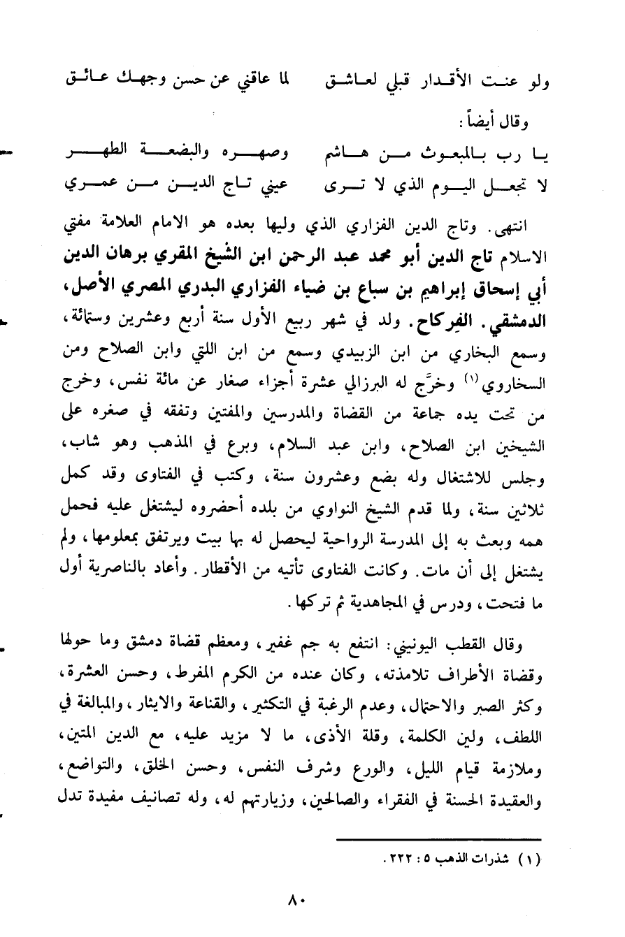 انتهى. وتاج الدين الفزاري الذي وليها بعده هو الإمام العلامة مفتي الإسلام تاج الدين أبو محمد عبد الرحمن ابن الشيخ المقري برهان الدين أبي إسحاق إبراهيم بن سباع بن ضياء الفزاري البدري المصري الأصل الدمشقي الفركاح ولد في شهر ربيع الأول سنة أربع وعشرين وستمائة وسمع البخاري من ابن الزبيدي وسمع من ابن اللتي وابن الصلاح ومن السخاروي1 وخرج له البرزالي عشرة أجزاء صغار عن مائة نفس وخرج من تحت يده جماعة من القضاه والمدرسين والمفتين وتفقه في صغره على الشيخين ابن الصلاح وابن عبد السلام وبرع في المذهب وهو شاب وجلس للاشتغال وله بضع وعشرون سنة وكتب في الفتاوى وقد كمل ثلاثين سنة ولما قدم الشيخ النواوي من بلده أحضروه ليشتغل عليه فحمل همه وبعث به إلى المدرسة الرواحية ليحصل له بها بيت ويرتفق بمعلومها ولم يشتغل إلى أن مات وكانت الفتاوى تأتيه من الأقطار وأعاد بالناصرية أول ما فتحت ودرس في المجاهدية ثم تركها.