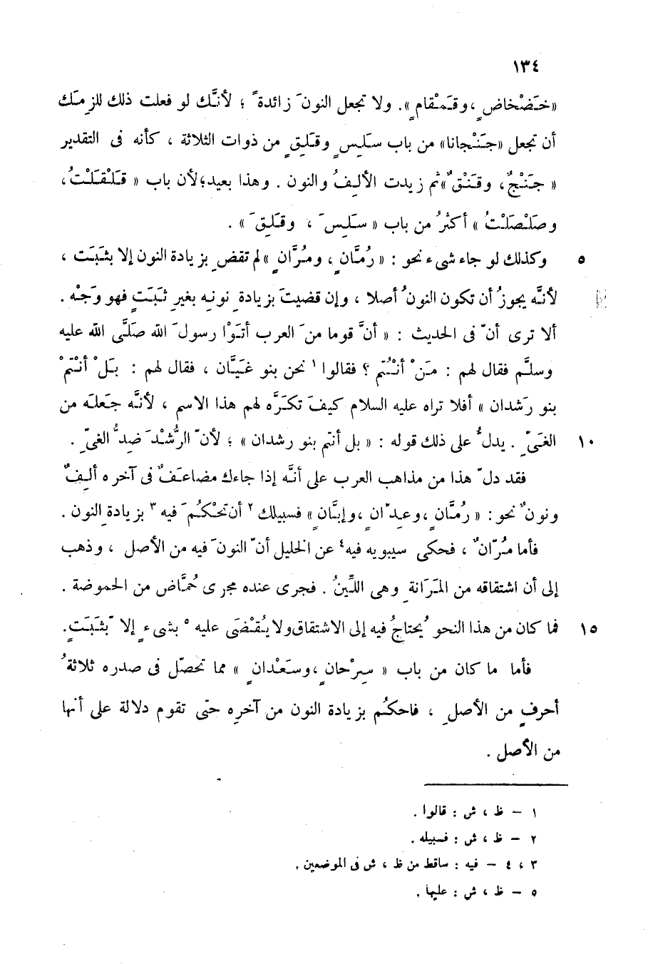 فقد دل هذا من مذاهب العرب على أنه إذا جاءك مضاعَف في آخره ألف ونون نحو: "رمان, وعدان, وإبان" فسبيلك2 أن تحكم فيه3 بزيادة النون.