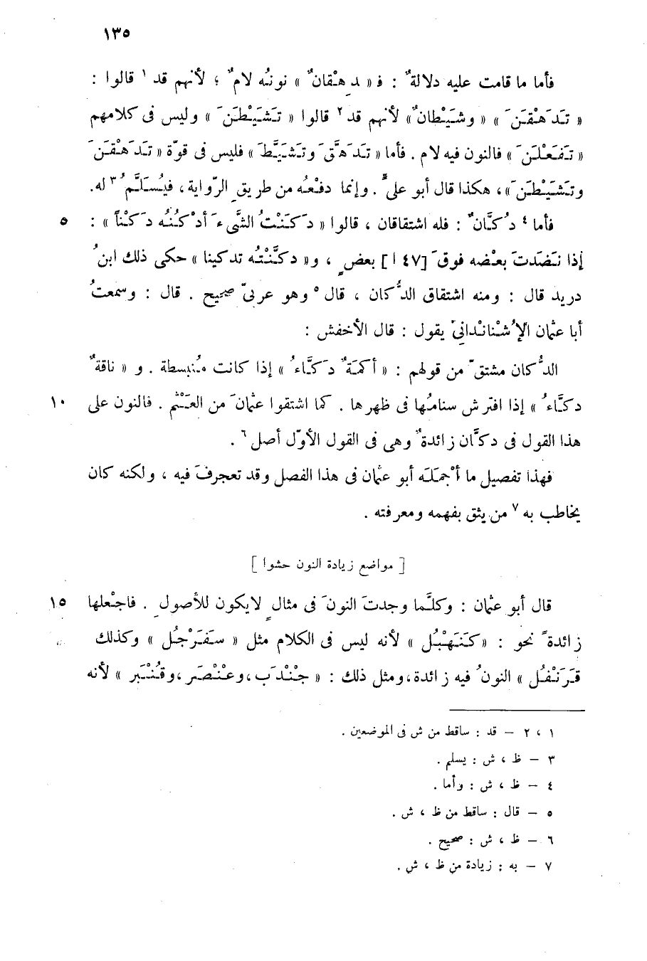 قال أبو عثمان: وكلما وجدت النون في مثال لا يكون للأصول, فاجعلها زائدة نحو: "كَنَهْبُل"؛ لأنه ليس في الكلام مثل "سَفَرْجُل", وكذلك "قَرَنْفُل" النون فيه زائدة، ومثل ذلك: "جُنْدَب, وعُنْصَر، وقُنْبَر"؛ لأنه
