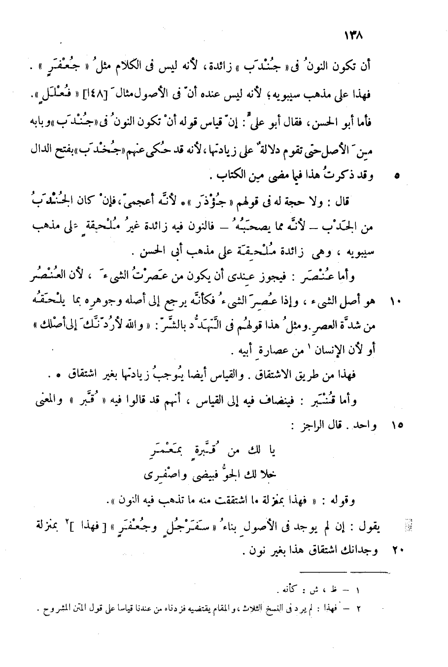 أن تكون النون في "جُنْدَب" زائدة؛ لأنه ليس في الكلام مثل "جُعْفَر". فهذا على مذهب سيبويه؛ لأنه ليس عنده أن في الأصول مثال "فُعْلَل". فأما أبو الحسن، فقال أبو علي: إن قياس قوله أن تكون النون في "جندب" وبابه من الأصل حتى تقوم دلالة على زيادتها؛ لأنه قد حكي عنهم: "جُخْدَب" بفتح الدال, وقد ذكرت هذا فيما مضى من الكتاب.