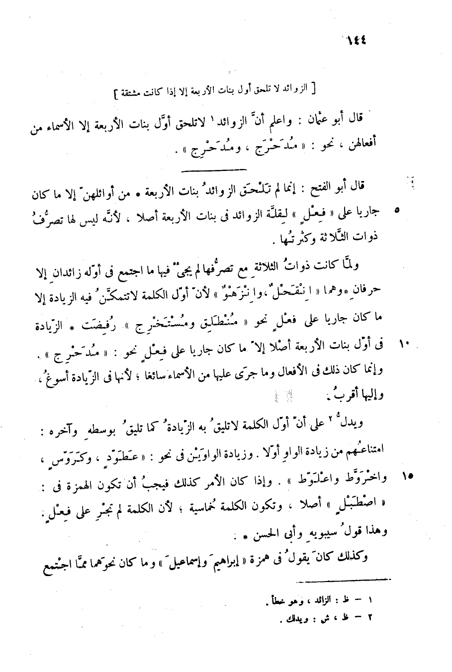 قال أبو عثمان: واعلم أن الزوائد1 لا تلحق أول بنات الأربعة إلا الأسماء من أفعالهن، نحو: "مُدَحْرَج، ومدحرِج".