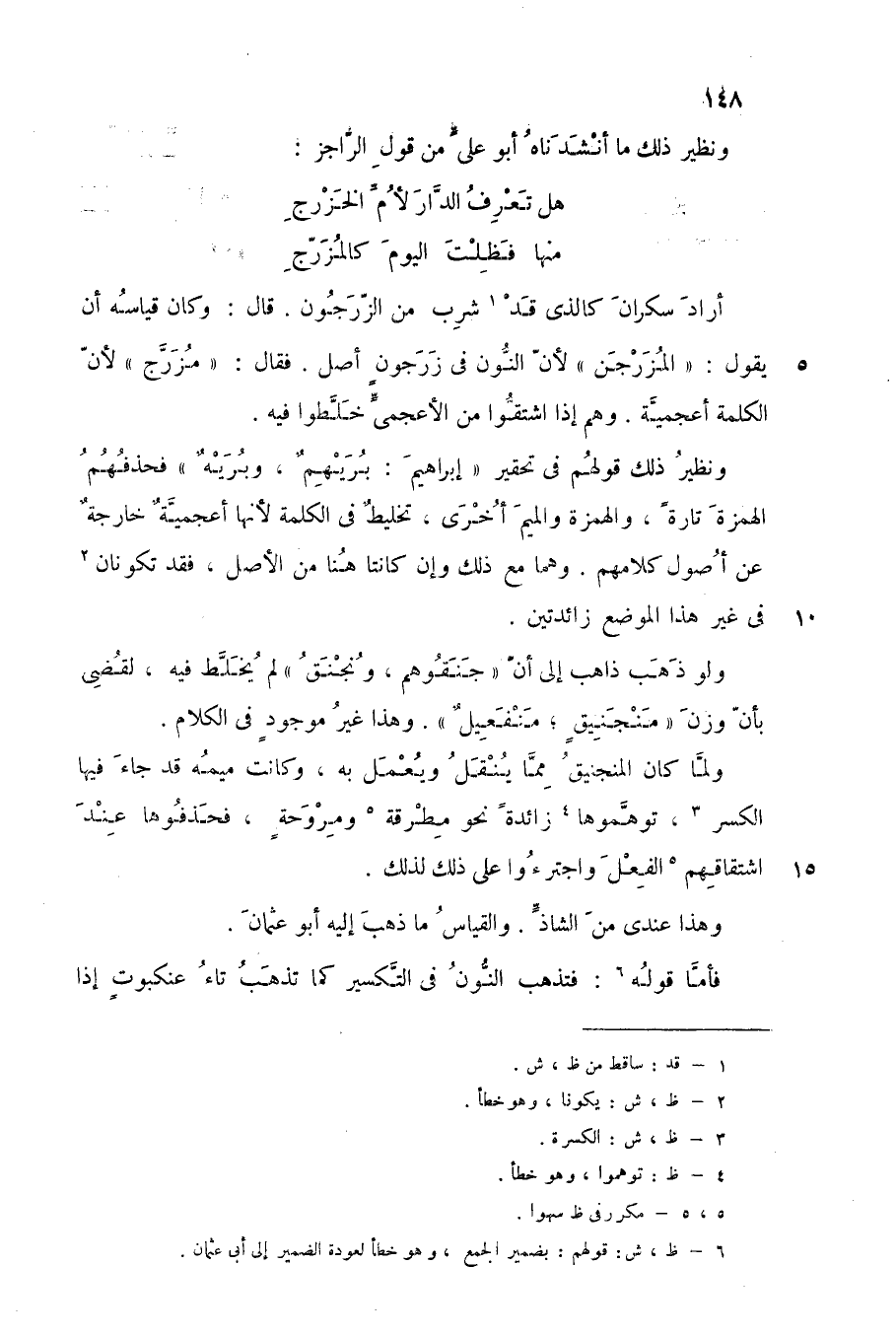 ونظير ذلك قولهم في تحقير "إبراهيم: بُرَيْهِم، وبُرَيْه", فحذفهم الهمزة تارة والهمزة والميم أخرى، تخليط في الكلمة؛ لأنها أعجمية خارجة عن أصول كلامهم. وهما مع ذلك وإن كانتا هنا من الأصل، فقد تكونان2 في غير هذا الموضع زائدتين.