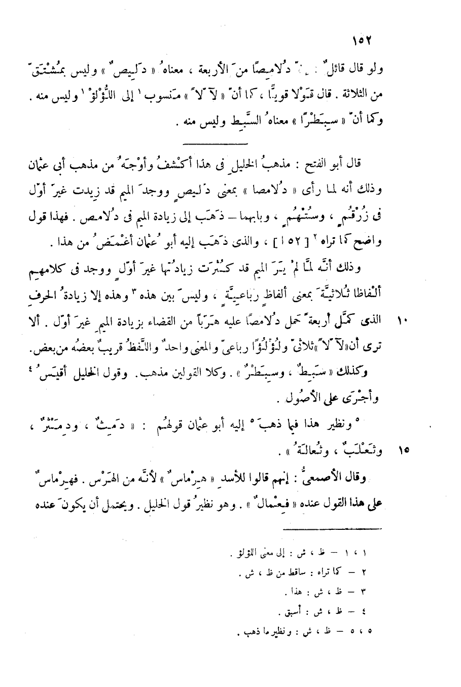 قال أبو الفتح: مذهب الخليل في هذا أكشف وأوجه من مذهب أبي عثمان, وذلك أنه لما رأى "دلامصا" بمعنى دليص, ووجد الميم قد زيدت غير أول في زرقم، وستهم، وبابهما؛ ذهب إلى زيادة الميم في دلامص. فهذا قول واضح كما تراه2، والذي ذهب إليه أبو عثمان أغمض من هذا.