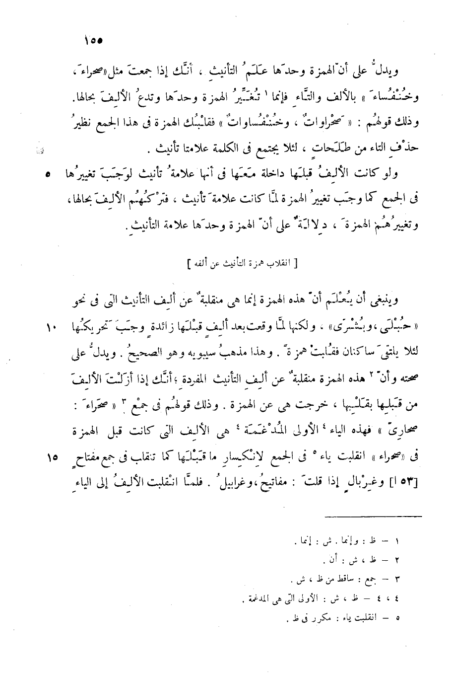 وينبغي أن يعلم أن هذه الهمزة إنما هي منقلبة عن ألف التأنيث التي في نحو "حبلى، وبشرى", ولكنها لما وقعت بعد ألف قبلها زائدة, وجب تحريكها لئلا يلتقي ساكنان فقلبت همزة. وهذا مذهب سيبويه وهو الصحيح. ويدل على صحته, وأن2 هذه الهمزة منقلبة عن ألف التأنيث المفردة، أنك إذا أزلت الألف من قبلها بقلبها، خرجت هي عن الهمزة. وذلك قولهم في جمع3 "صحراء: صحارِي", فهذه الياء4 الأولى المدغمة4 هي الألف التي كانت قبل الهمزة في "صحراء" انقلبت5 في الجمع لانكسار ما قبلها, كما تنقلب في جمع مفتاح وغِرْبال إذا قلت: مفاتيح، وغرابيل. فلما انقلبت الألف إلى الياء