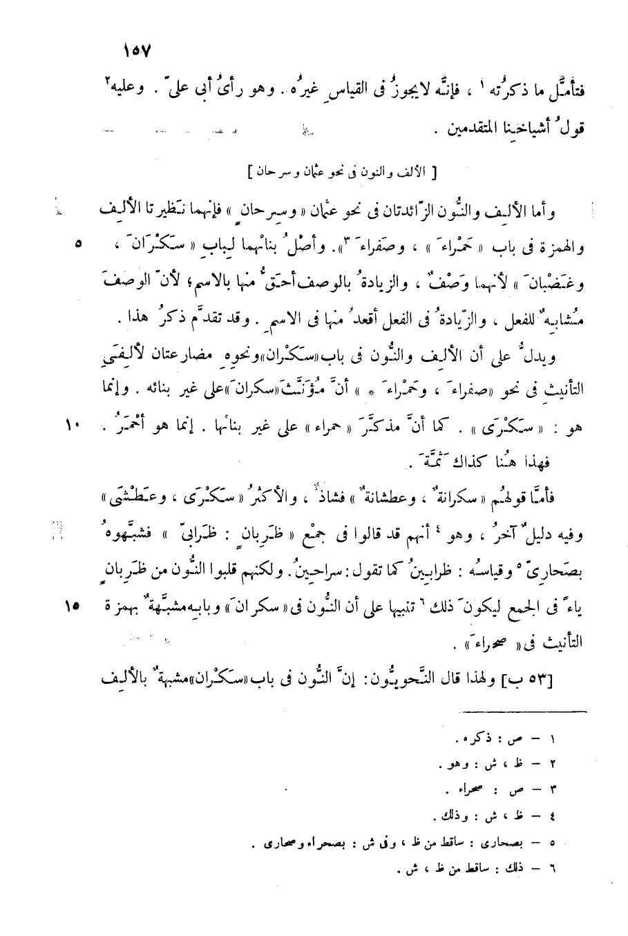 فأما قولهم: "سكرانة، وعطشانة" فشاذ، والأكثر "سكرى، وعطشى", وفيه دليل آخر وهو4 أنهم قد قالوا في جمع "ظَرِبان: ظَرابيّ", فشبهوه بصحارِيّ5, وقياسه: ظرابِين كما تقول: سراحين. ولكنهم قلبوا النون من ظَرِبان ياء في الجمع ليكون ذلك6 تنبيها على أن النون في "سكران" وبابه مشبهة بهمزة التأنيث في "صحراء".