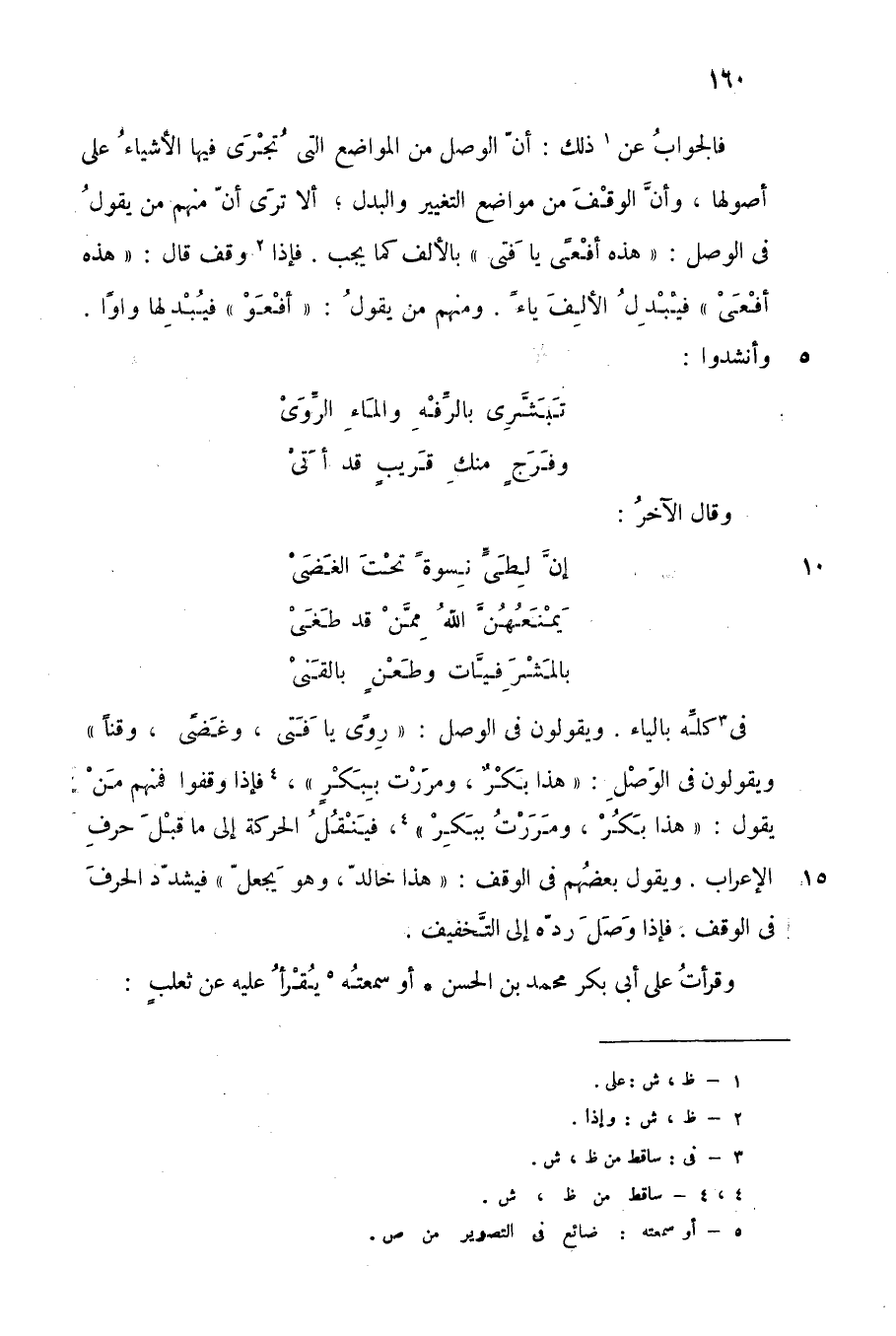 فالجواب عن1 ذلك: أن الوصل من المواضع التي تُجْرَى فيها الأشياء على أصولها، وأن الوقف من مواضع التغيير والبدل، ألا ترى أن منهم من يقول في الوصل: "هذه أفعى يا فتى" بالألف كما يجب, فإذا2 وقف قال: "هذه أفعَيْ" فيبدل الألف ياء. ومنهم من يقول: "أفْعَوْ" فيبدلها واوا. وأنشدوا: