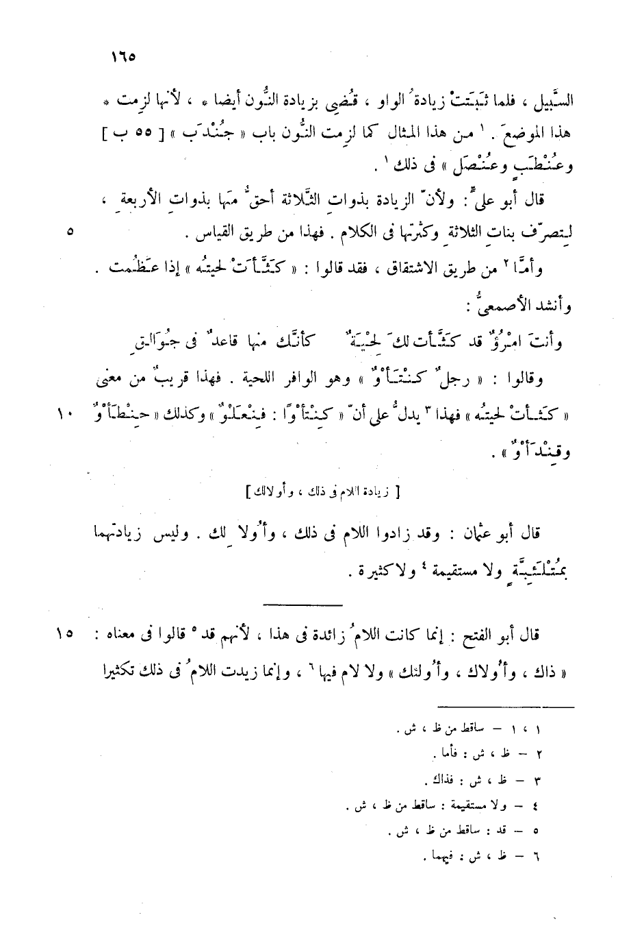 قال أبو عثمان: وقد زادوا اللام في ذلك وأولالك, وليس زيادتهما بمُتْلَئِبّة ولا مستقيمة4 ولا كثيرة.