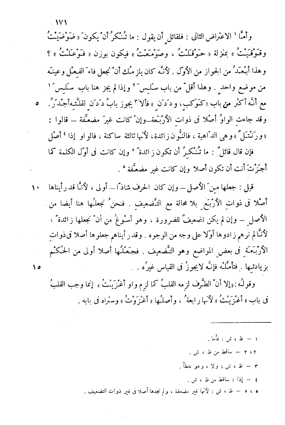 5، 5 ظ، ش: "لأنها غير مضعفة، ولم نجدها أصلا في غير ذوات التضعيف".