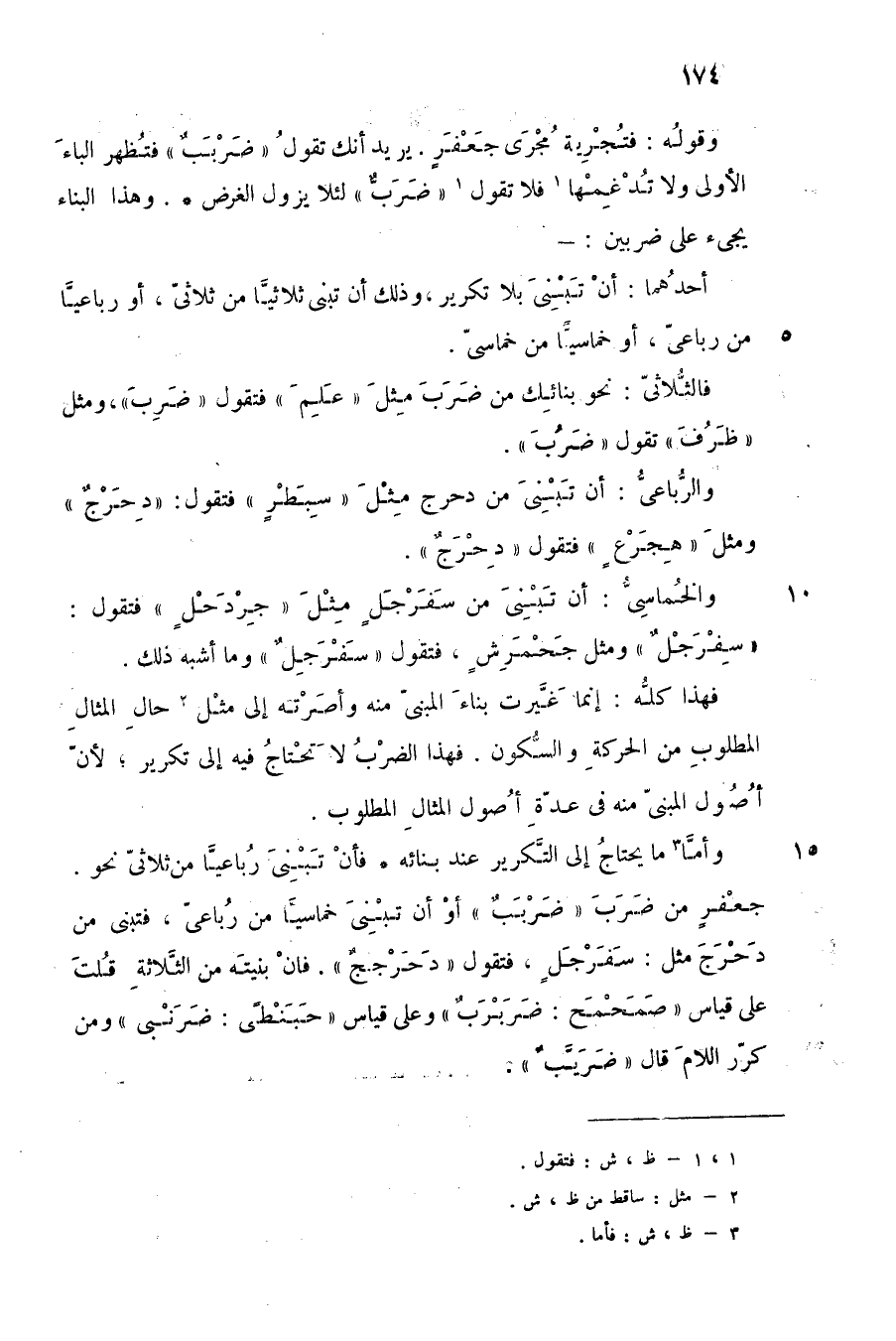 وأما3 ما يحتاج إلى التكرير عند بنائه, فأن تبني رباعيا من ثلاثي نحو: جعفر من ضرب "ضَرْبَب", أو أن تبني خماسيا من رباعي، فتبني من دحرج مثل: سفرجل, فتقول: "دَحَرْجَج". فإن بنيتَهُ من الثلاثة قلت على قياس "صَمَحْمَح: ضَرَبْرَب", وعلى قياس "حَبَنْطى: ضَرَنْبى" ومن كرر اللام قال: "ضربب".